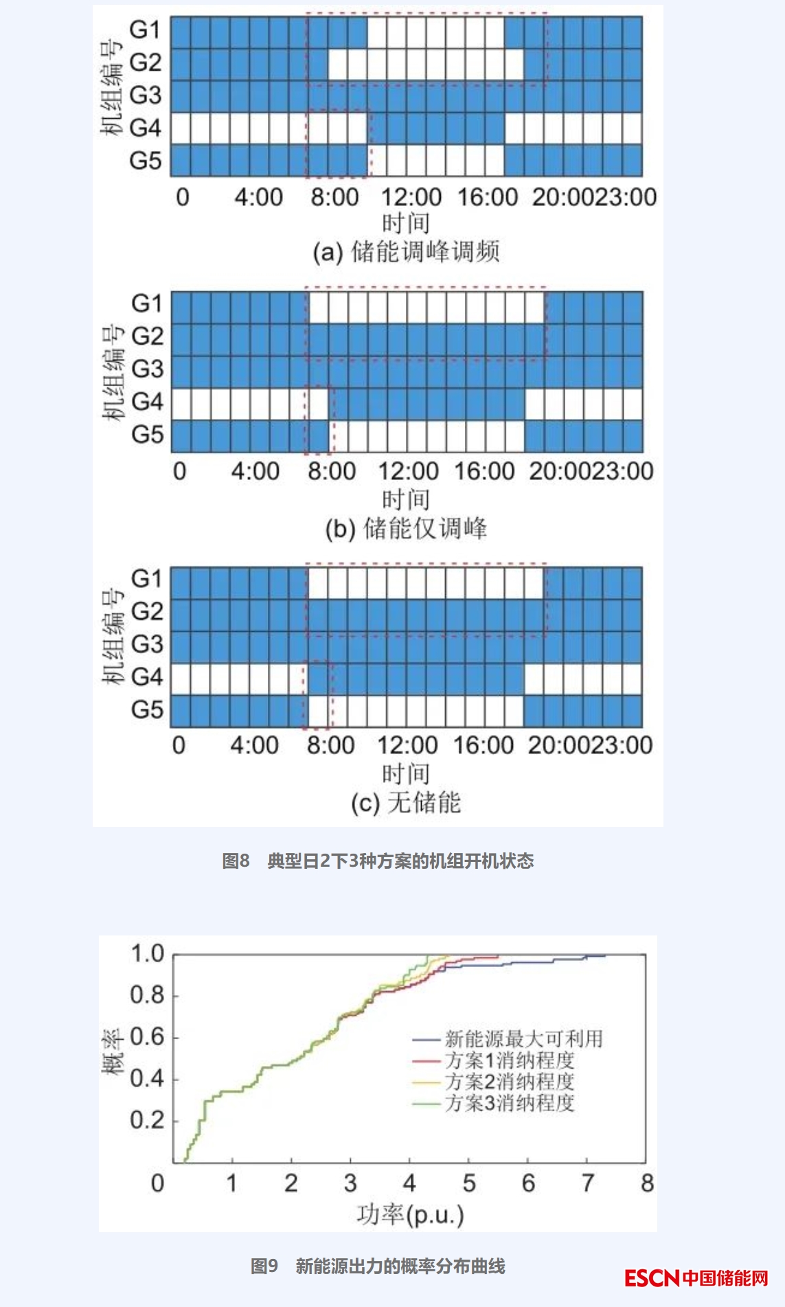 典型日2的機(jī)組開機(jī)狀態(tài)如圖8所示,方案1相較方案2、3,其7:00~18:00時(shí)段火電機(jī)組G1、G2的關(guān)機(jī)時(shí)間更長,說明配置儲(chǔ)能后,區(qū)域Ⅰ的負(fù)荷大部分由新能源機(jī)組承擔(dān)。方案2、3則發(fā)生了新能源的棄風(fēng)、棄光現(xiàn)象,可見配置儲(chǔ)能有利于消納新能源,并減少火電機(jī)組運(yùn)行。將典型日數(shù)據(jù)輸入模型模擬運(yùn)行,得到年8760個(gè)小時(shí)各方案的新能源出力分布函數(shù)曲線如圖9所示,方案1中儲(chǔ)能雖然參與了系統(tǒng)的調(diào)頻調(diào)峰場景,系統(tǒng)仍不能將新能源出力完全消納,這是因?yàn)檫\(yùn)行模型是以總運(yùn)行成本最低為目標(biāo)函數(shù),若完全消納則不能達(dá)到全局最優(yōu),但是與方案2、3相比,方案1已實(shí)現(xiàn)了大幅消納新能源出力的效果。