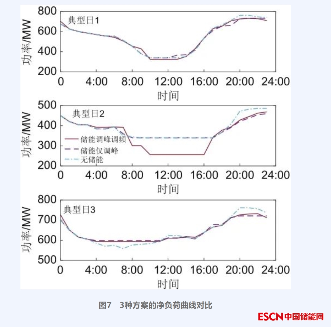 為分析儲(chǔ)能系統(tǒng)配置后對系統(tǒng)調(diào)峰效果的影響,引入3個(gè)方案下凈負(fù)荷曲線,如圖7所示,以各典型日無儲(chǔ)能方案作為對比,可看出在18:00~24:00時(shí)段,方案1和方案2的系統(tǒng)凈負(fù)荷更低,且方案1系統(tǒng)凈負(fù)荷低于方案2系統(tǒng)凈負(fù)荷,說明考慮調(diào)峰調(diào)頻運(yùn)行的儲(chǔ)能配置相較于方案2、3更有利于削減系統(tǒng)尖峰負(fù)荷。典型日3的4:00~10:00時(shí)段,方案1和方案2的系統(tǒng)凈負(fù)荷高于方案3的系統(tǒng)凈負(fù)荷,說明配置的儲(chǔ)能填補(bǔ)了系統(tǒng)負(fù)荷缺額,此時(shí)儲(chǔ)能系統(tǒng)作為負(fù)荷吸收電網(wǎng)電能進(jìn)行充電。典型日2的7:00~17:00時(shí)段,方案1系統(tǒng)凈負(fù)荷低于方案2、3的系統(tǒng)凈負(fù)荷,這是因?yàn)榈湫腿?的風(fēng)光出力大幅高于典型日1、3出力,系統(tǒng)凈負(fù)荷低體現(xiàn)了儲(chǔ)能在系統(tǒng)中發(fā)揮了調(diào)峰的作用。