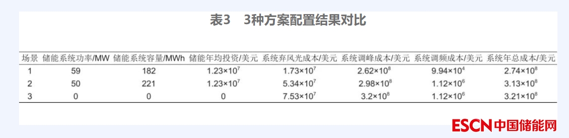 為分析考慮雙重應(yīng)用場景配置儲(chǔ)能的合理性,設(shè)計(jì)3個(gè)規(guī)劃方案進(jìn)行對比。方案1考慮系統(tǒng)調(diào)峰調(diào)頻需求配置儲(chǔ)能;相較于雙重應(yīng)用場景,現(xiàn)有文獻(xiàn)[22-23]多考慮儲(chǔ)能系統(tǒng)參與單一調(diào)峰場景的配置優(yōu)化,因此設(shè)定方案2,僅考慮系統(tǒng)調(diào)峰需求配置儲(chǔ)能,作為本工作規(guī)劃方案的對比;方案3無儲(chǔ)能,僅有火電機(jī)組調(diào)峰調(diào)頻。