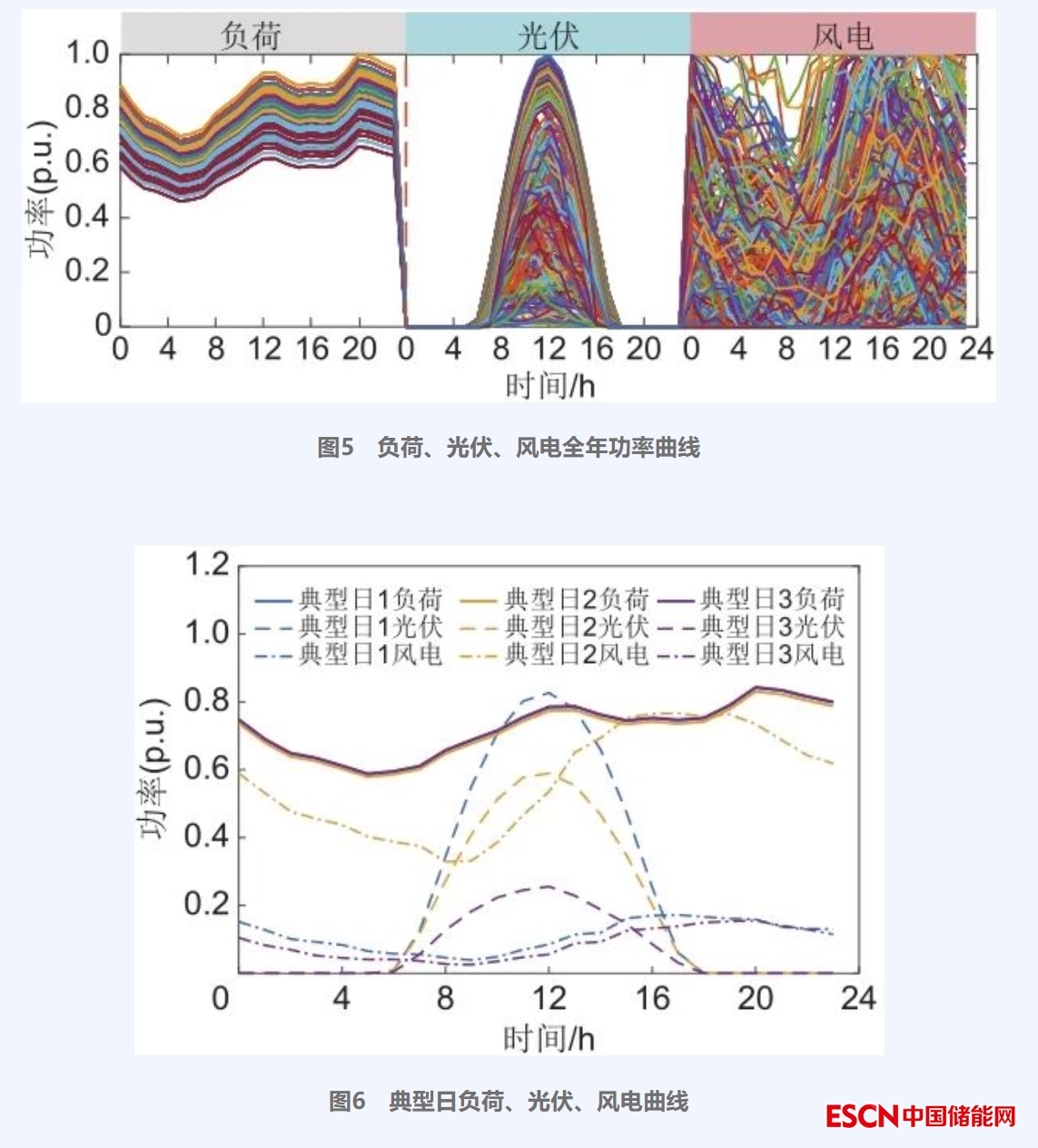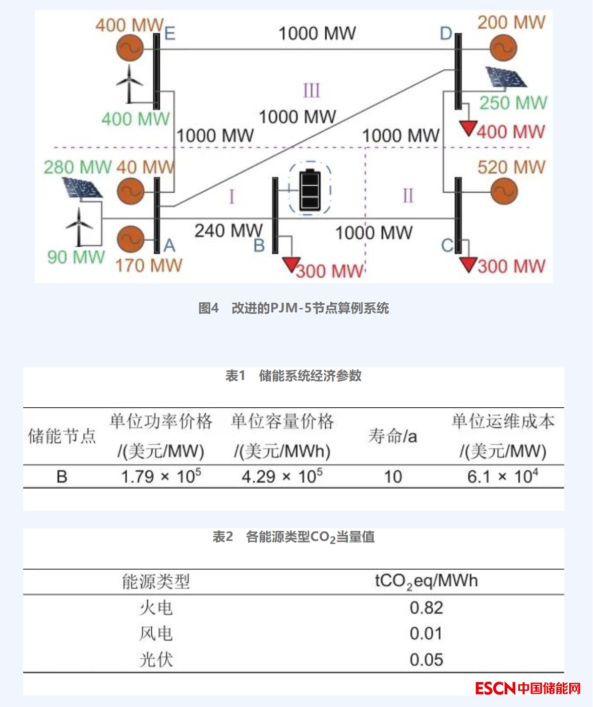 本文采用修改的PJM-5節(jié)點(diǎn)系統(tǒng)進(jìn)行仿真算例分析,如圖4所示,算例系統(tǒng)包含5臺(tái)火電機(jī)組,風(fēng)力和光伏發(fā)電各2臺(tái),火風(fēng)光總裝機(jī)容量分別為1330 MW、490 MW和530 MW,系統(tǒng)最大總負(fù)荷1000 MW。算例PJM-5節(jié)點(diǎn)系統(tǒng)分為3個(gè)控制區(qū),區(qū)域Ⅰ的B節(jié)點(diǎn)配置儲(chǔ)能,其技術(shù)參數(shù)圖片、圖片為0.95,圖片、圖片分別為0.1和0.9,其經(jīng)濟(jì)參數(shù)如表1所示。碳足跡約束中各能源類型的CO2當(dāng)量值如表2所示。單位電量的懲罰系數(shù)圖片取100(p.u.,標(biāo)幺值)。算例負(fù)荷、光伏、風(fēng)電全年功率曲線如圖5所示,通過對其進(jìn)行聚類,得到3個(gè)典型日的功率時(shí)序曲線如圖6所示,各典型日天數(shù)分別為135、128、102天。