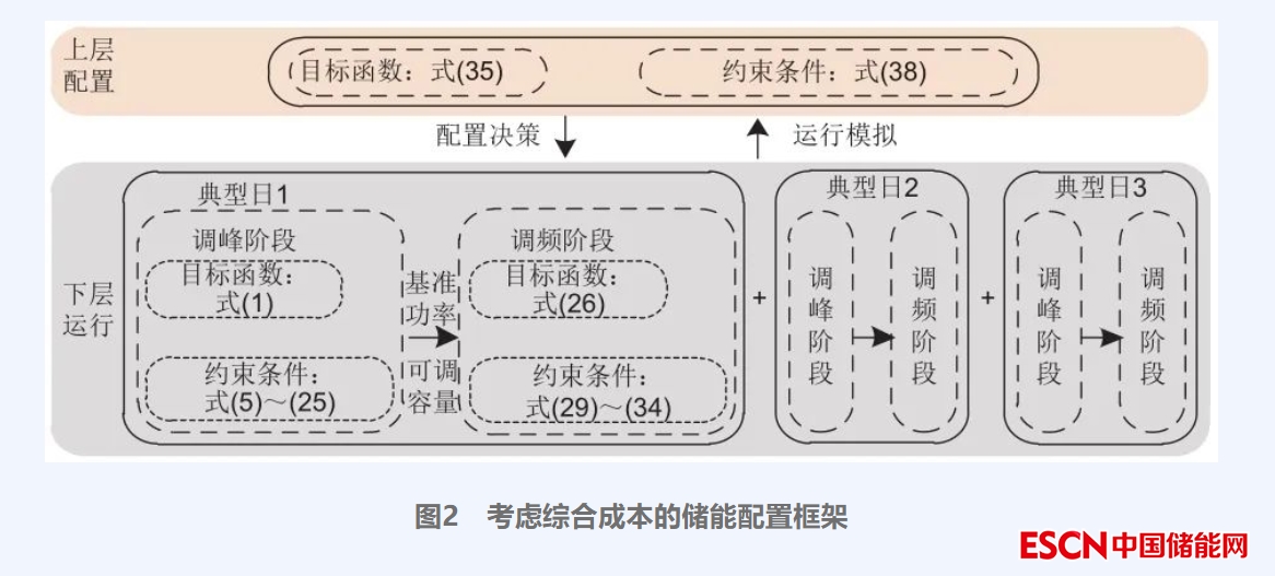 建立儲(chǔ)能規(guī)劃-運(yùn)行雙層優(yōu)化模型,如圖2所示。上層為儲(chǔ)能配置問題,以規(guī)劃年儲(chǔ)能投資成本和系統(tǒng)運(yùn)行成本最小為目標(biāo);下層為典型日運(yùn)行模擬問題,分為調(diào)峰-調(diào)頻兩個(gè)階段即第1節(jié)所述模型。雙層優(yōu)化問題的上層模型生成儲(chǔ)能配置結(jié)果并傳遞給下層,下層模型基于不同典型日生成運(yùn)行模擬結(jié)果并回傳給上層,隨后上層計(jì)算規(guī)劃年總成本并更新儲(chǔ)能配置結(jié)果,通過不斷交互迭代實(shí)現(xiàn)儲(chǔ)能系統(tǒng)的最優(yōu)配置。