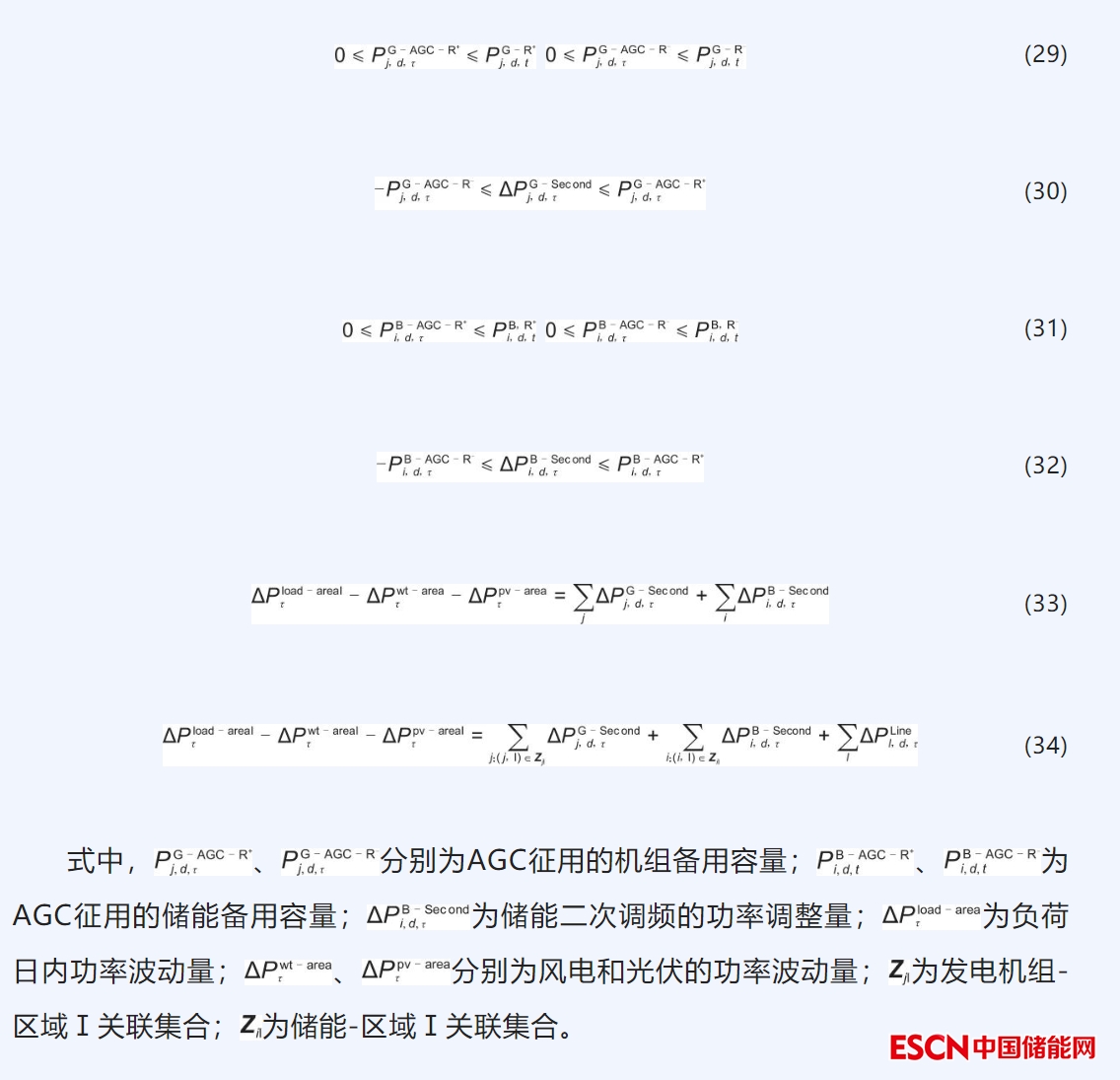 調(diào)頻運(yùn)行模擬約束條件包含發(fā)電機(jī)及儲(chǔ)能系統(tǒng)的調(diào)頻約束、電網(wǎng)功率平衡約束等。式(29)表示AGC可征用的機(jī)組備用容量約束,式(30)為機(jī)組二次調(diào)頻約束。與常規(guī)機(jī)組類似,式(31)~(32)表示儲(chǔ)能的調(diào)頻約束。式(33)表示日內(nèi)負(fù)荷、新能源發(fā)生計(jì)劃外波動(dòng)時(shí)的功率平衡約束,此外各控制區(qū)也要滿足功率平衡,以區(qū)域Ⅰ為例見式(34)。