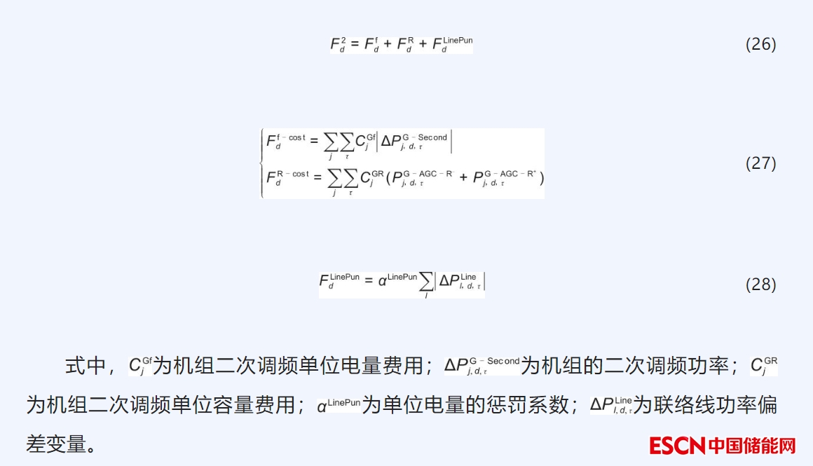 電力系統(tǒng)由多個(gè)控制區(qū)互聯(lián)組成,各互聯(lián)系統(tǒng)的靜態(tài)頻率保持一致,在調(diào)度管理上各區(qū)域的源荷功率平衡應(yīng)由本區(qū)域自己解決,也就是說當(dāng)某一區(qū)域發(fā)生功率不平衡時(shí),在保證系統(tǒng)頻率在正常范圍的前提下,聯(lián)絡(luò)線交互功率穩(wěn)態(tài)值應(yīng)與計(jì)劃值一致。對此,調(diào)頻階段目標(biāo)函數(shù)包含聯(lián)絡(luò)線交互功率偏差懲罰函數(shù),以保證區(qū)域間聯(lián)絡(luò)線有功交換符合系統(tǒng)安全優(yōu)質(zhì)運(yùn)行要求。目標(biāo)函數(shù)見式(26),具體包含機(jī)組二次調(diào)頻電量費(fèi)用圖片和容量費(fèi)用圖片,以及聯(lián)絡(luò)線的偏差懲罰圖片。