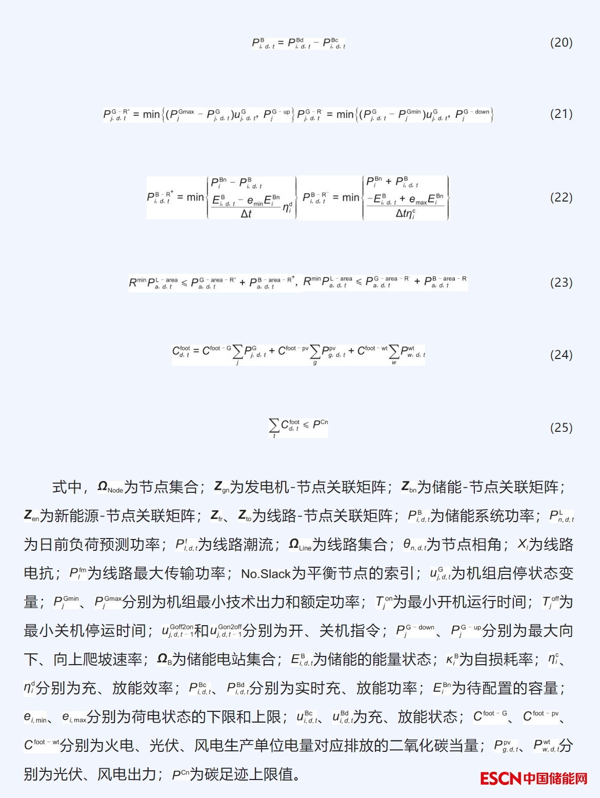 調(diào)峰運(yùn)行模擬約束條件考慮電網(wǎng)功率平衡以及各發(fā)電主體實(shí)際物理限制。本工作特別考慮了電網(wǎng)運(yùn)行的碳足跡約束,進(jìn)一步促進(jìn)新能源的消納。式(5)~(9)表示網(wǎng)絡(luò)潮流約束,式(10)~(14)表示機(jī)組運(yùn)行約束,式(15)~(20)表示儲(chǔ)能運(yùn)行約束,式(21)表示機(jī)組備用約束,式(22)表示儲(chǔ)能備用約束,式(23)表示系統(tǒng)分區(qū)備用約束,式(24)~(25)表示碳足跡約束。