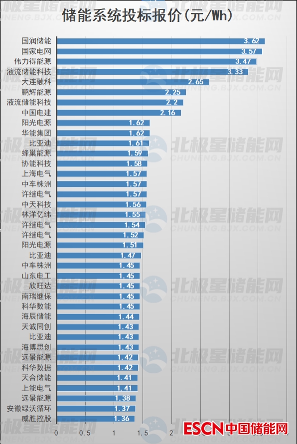 其中新能源配套儲(chǔ)能投標(biāo)報(bào)價(jià)最高的為華能甘肅永登坪城二期風(fēng)電7.5MW/15MWh儲(chǔ)能系統(tǒng)采購(gòu),中標(biāo)人為華能清能院,投標(biāo)報(bào)價(jià)2431.7萬(wàn)元,投標(biāo)單價(jià)約1.62元/Wh。