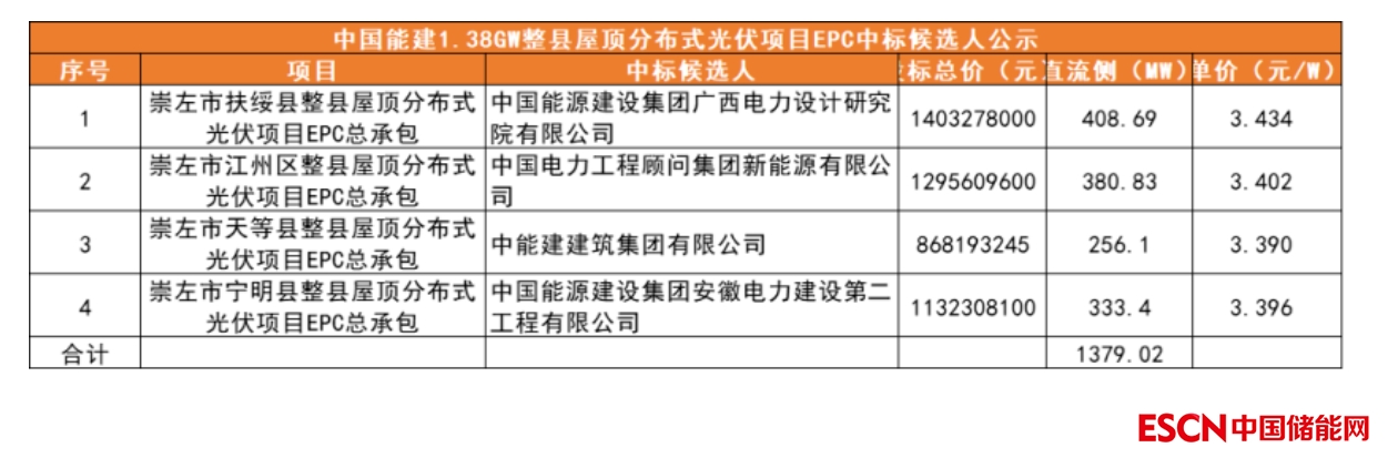 同日,中國能建廣西崇左市4個整縣屋頂分布式光伏項目也公示了EPC中標候選。價格在3.390元/W~3.434元/W。扶綏縣中標人為中國能源建設集團廣西電力設計研究院,單價3.434元/W;江州區(qū)中標人為中國電力工程顧問集團新能源,單價3.402元/W;天等縣中標人為中能建建筑集團有限公司,單價3.390元/W;寧明縣中標人為中國能源建設集團安徽電力建設第二工程,單價3.396元/W。具體如下:
