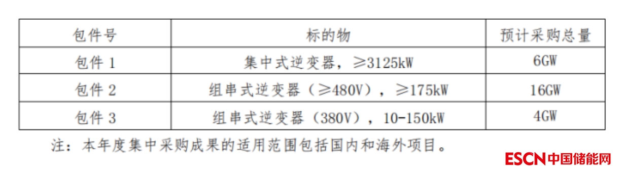 逆變器:分為3個包件進(jìn)行投標(biāo),其中包括6GW集中式逆變器,≥3125kW;16GW組串式逆變器(≥480V),≥175kW;4GW組串式逆變器(380V),10-150kW。潛在投標(biāo)人可以對某一包件或全部包件進(jìn)行投標(biāo),各包件組成詳見下表: