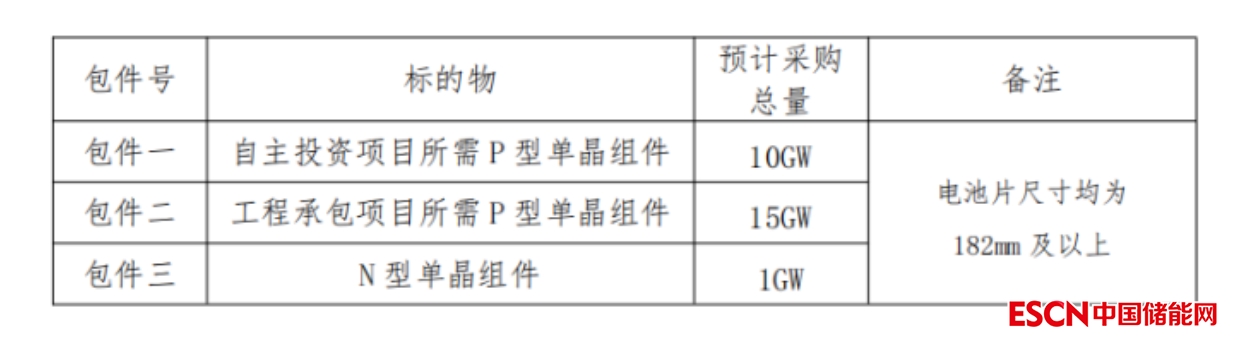 組件方面:本次招標(biāo)分為3個包件進(jìn)行投標(biāo),其中包括自主投資項目所需P型單晶組件10GW、工程承包項目所需P型組件15GW、以及N型單晶組件1GW。電池片尺寸均要求182mm及以上。潛在投標(biāo)人可以對某一包件或全部包件進(jìn)行投標(biāo),各包件組成詳見下表:
