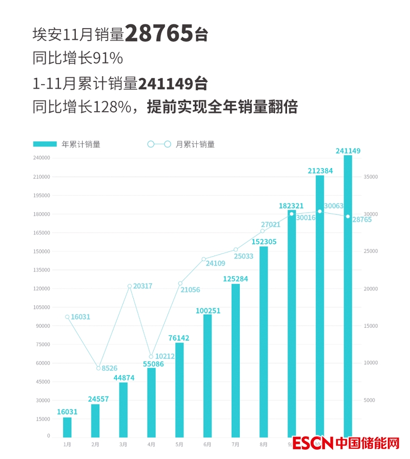 毫無疑問,埃安目前正值高速發(fā)展階段,埃安11月份銷量28765輛,同比增長(zhǎng)91%,今年1-11月份累計(jì)銷量241149輛,同比增長(zhǎng)128%,提前實(shí)現(xiàn)全年銷量翻倍。按照埃安年初設(shè)定的“保20萬輛,挑戰(zhàn)25萬輛”銷量目標(biāo),這一目標(biāo)已經(jīng)基本可以看作:已完成。