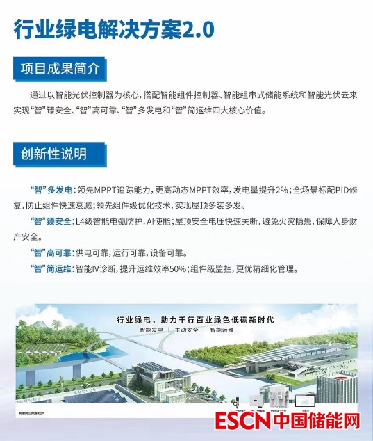 面向行業(yè)用戶,華為智能光伏行業(yè)綠電解決方案2.0通過以智能光伏控制器為核心,搭配智能組件控制器、智能組串式儲(chǔ)能系統(tǒng)和智能光伏云來實(shí)現(xiàn)“智”臻安全、“智”高可靠、“智”多發(fā)電和“智”簡運(yùn)維四大核心價(jià)值,滿足各類工商業(yè)場景需求。同時(shí),華為智能光伏行業(yè)綠電解決方案2.0入圍創(chuàng)新成果案例集。