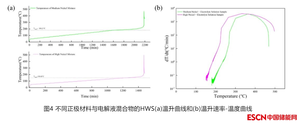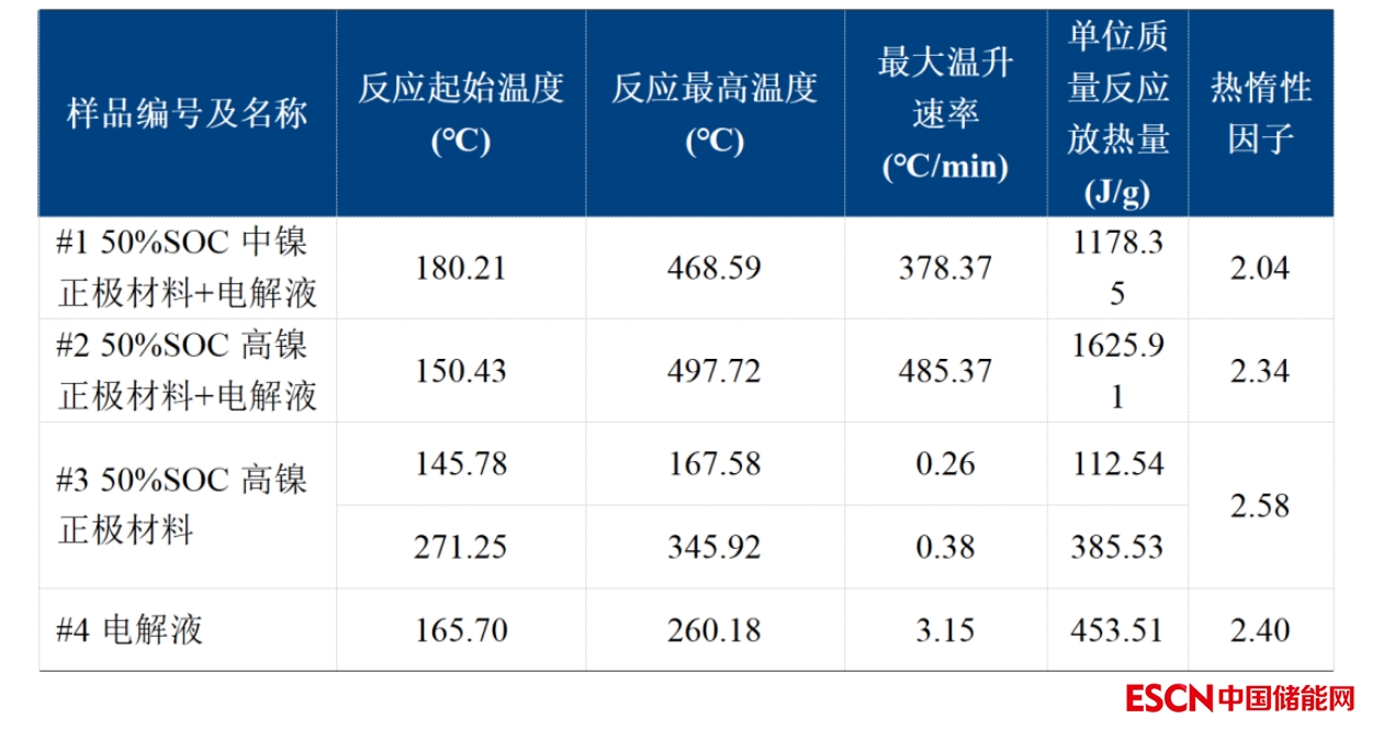 如圖4與表2所示,50%SOC中鎳正極材料&電解液混合物的自放熱起始溫度高于高鎳材料&電解液的數值,其反應最高溫度和最大溫升速率低于高鎳材料&電解液的數值,證明高鎳正極的熱穩(wěn)定性相對較低。