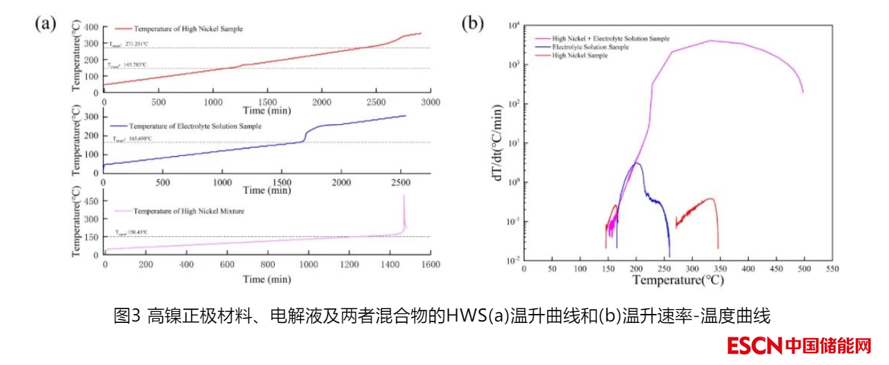 50%SOC高鎳正極材料、電解液及兩者混合物的熱分解放熱特性如圖3所示,正極材料的自放熱起始溫度為145.78℃,而電解液略高,達到165.70℃。因此兩者按一定比例混合后自放熱起始溫度為150.43℃,介于兩者之間;同時,可檢測到單組分正極材料存在第二段放熱反應,反應起始溫度為271.25℃。另外,可以證明高鎳正極材料和電解液之間存在劇烈反應,最大溫升速率達到485.37℃/min,而對于單獨的正極材料或者電解液,其最大溫升速率均不超過5℃/min。上述結果符合相關文獻報道[2][3]。
