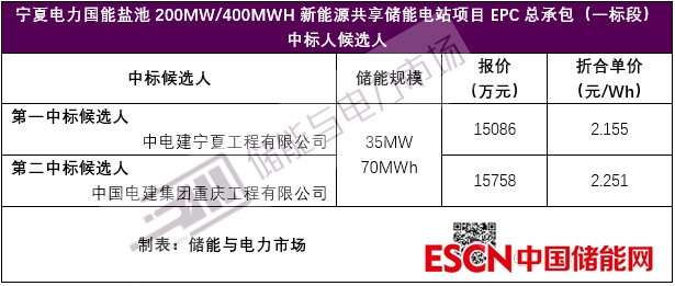中國儲能網(wǎng)訊:近日,寧夏電力國能鹽池200MW/400MWH新能源共享儲能電站項目EPC總承包(一標(biāo)段)中標(biāo)人候選人公示對外發(fā)布。涉及儲能規(guī)模35MW/70MWh。中電建寧夏工程有限公司以總報價15086萬元,折合單價2.155元/Wh,成為第一中標(biāo)候選人。