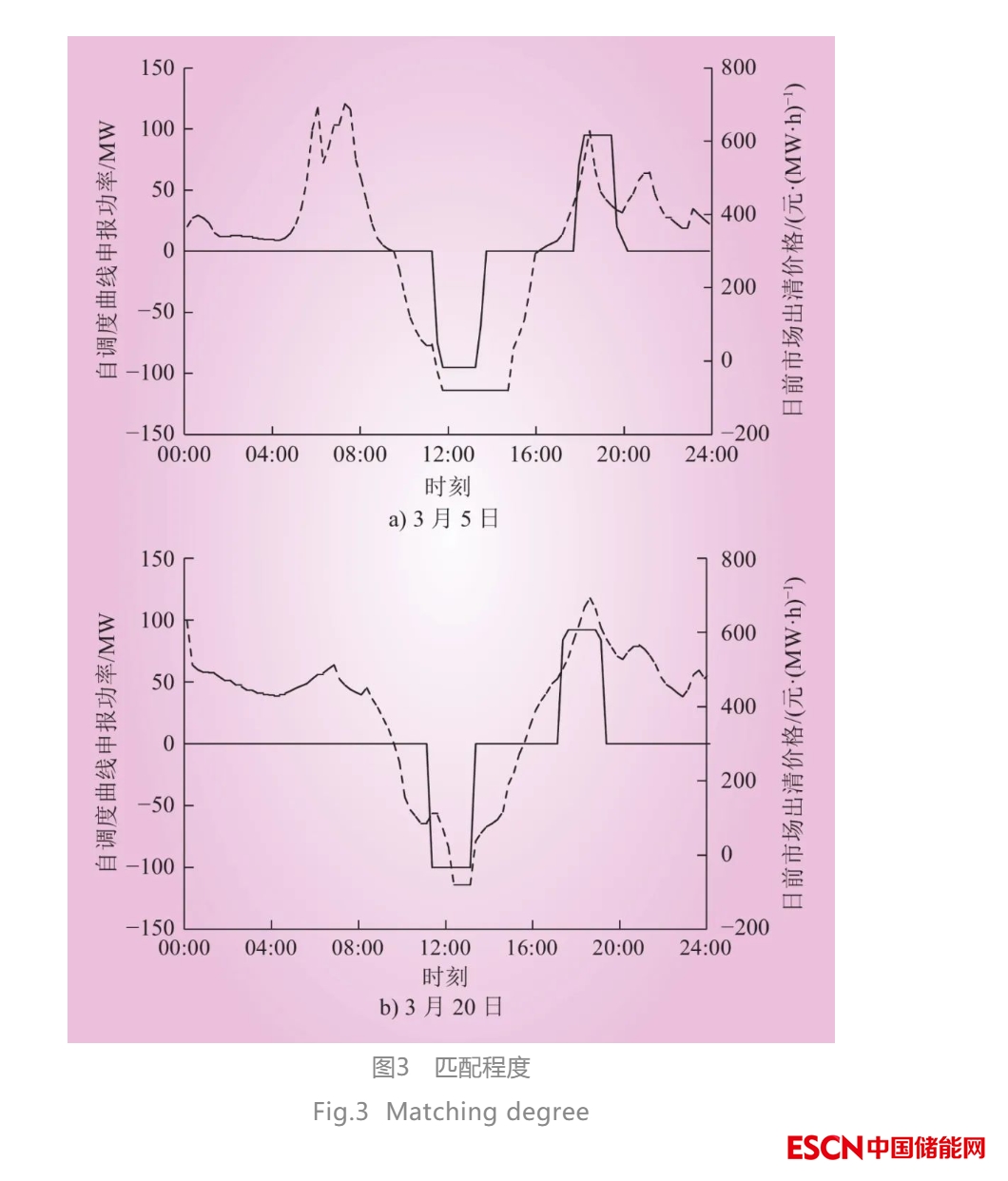 以某獨立儲能2022年3月5日、20日申報自調(diào)度曲線和日前現(xiàn)貨市場出清價格為例,申報與出清結(jié)果匹配程度如圖3所示。從圖3可以看出,2022年3月20日自調(diào)度曲線與日前市場出清價格契合程度較2022年3月5日有顯著提升。