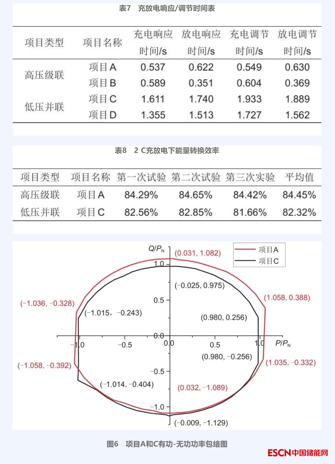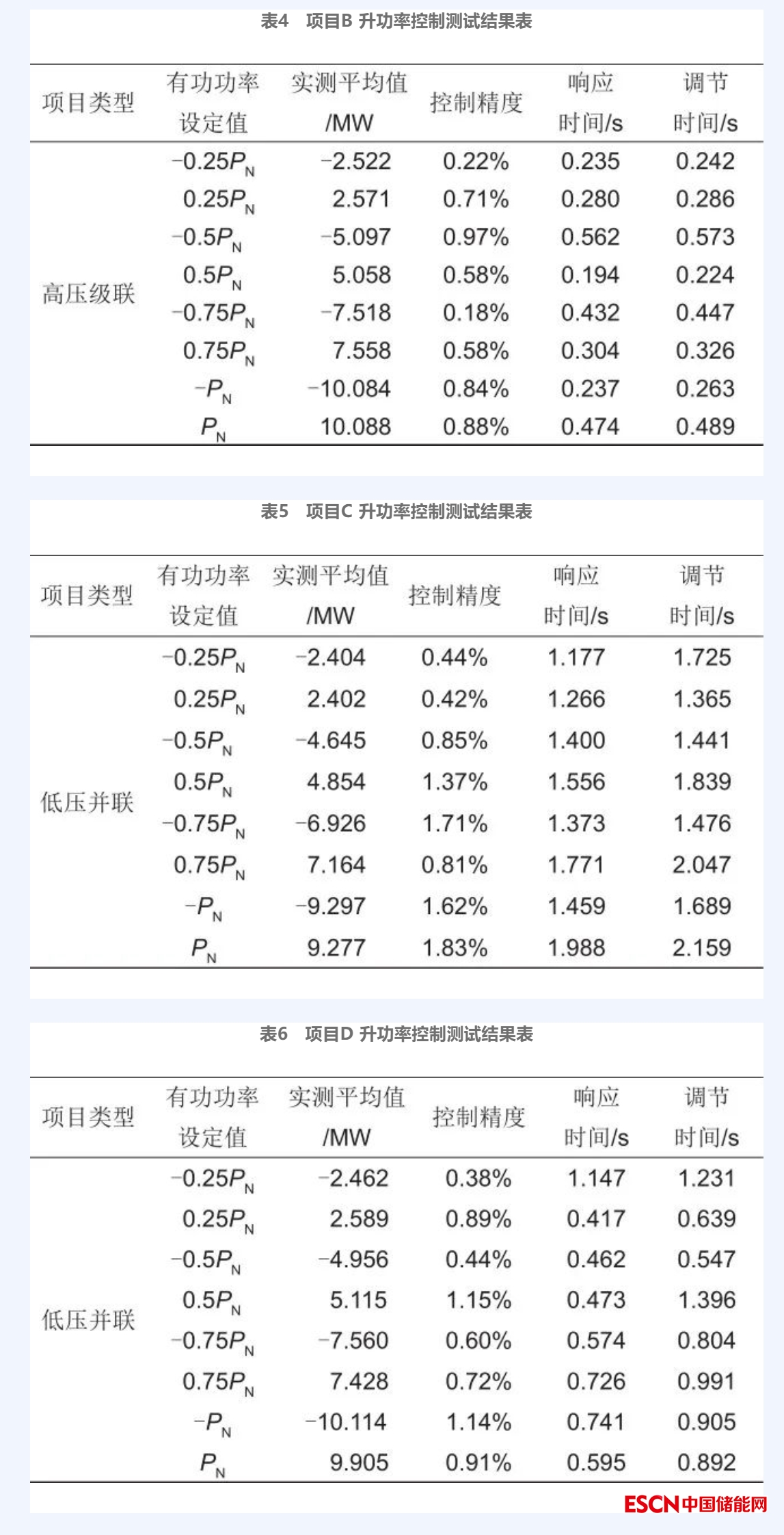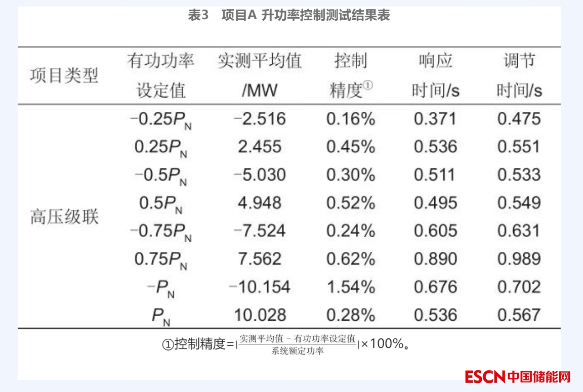 對(duì)4個(gè)項(xiàng)目進(jìn)行有功功率控制測(cè)試,選取升功率結(jié)果進(jìn)行分析,通過(guò)表3~表6的對(duì)比,總體上看,在有功控制性能測(cè)試方面,項(xiàng)目A、B的控制精度均值分別為0.51%和0.62%、響應(yīng)時(shí)間的均值分別為0.578 s和0.340 s、調(diào)節(jié)時(shí)間均值分別為0.625 s和0.356 s;項(xiàng)目C和項(xiàng)目D的控制精度均值分別為1.13%和0.78%、響應(yīng)時(shí)間的均值分別為1.499 s和0.642 s、調(diào)節(jié)時(shí)間均值分別為1.718 s和0.926 s;可以看出,高壓級(jí)聯(lián)儲(chǔ)能系統(tǒng)對(duì)功率的控制精度及控制時(shí)間較優(yōu)于低壓并聯(lián)儲(chǔ)能系統(tǒng)。在低壓并聯(lián)儲(chǔ)能系統(tǒng)中,以5 MW儲(chǔ)能單元為例,儲(chǔ)能管理系統(tǒng)在接收到指令后需要將指令下發(fā)到儲(chǔ)能單元,每個(gè)儲(chǔ)能單元通過(guò)8臺(tái)PCS控制電池出力,完成相應(yīng)指令。而在高壓級(jí)聯(lián)儲(chǔ)能系統(tǒng)中,儲(chǔ)能單元只需要通過(guò)控制1臺(tái)PCS便可完成對(duì)電池的控制,因此縮短了響應(yīng)時(shí)間和調(diào)節(jié)時(shí)間。