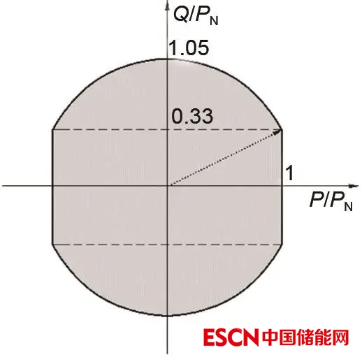 在功率控制方面,電化學(xué)儲(chǔ)能系統(tǒng)在其變流器額定功率運(yùn)行范圍內(nèi)應(yīng)具備四象限控制功能,有功功率和無(wú)功功率應(yīng)在圖5所示的陰影區(qū)域內(nèi)動(dòng)態(tài)可調(diào)。根據(jù)GB/T 36548—2018《電化學(xué)儲(chǔ)能系統(tǒng)接入電網(wǎng)測(cè)試規(guī)范》,測(cè)試方法如下: