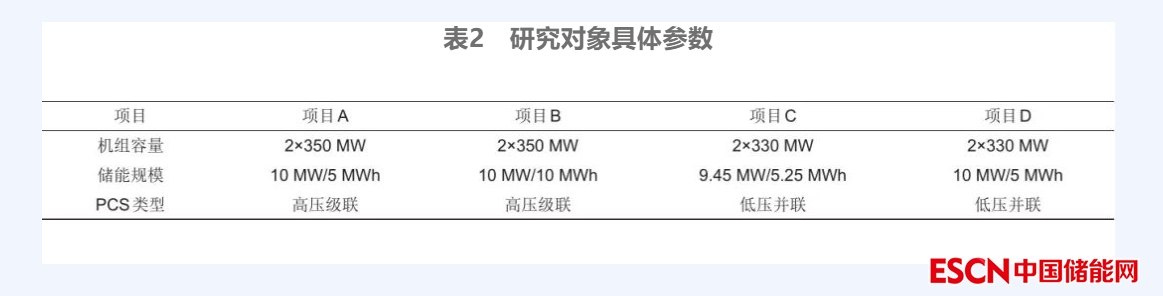 綜上所述,在火儲(chǔ)聯(lián)合調(diào)頻項(xiàng)目中,儲(chǔ)能系統(tǒng)的功率控制、充放電響應(yīng)時(shí)間以及能量轉(zhuǎn)換效率性能是衡量火儲(chǔ)聯(lián)調(diào)項(xiàng)目?jī)?chǔ)能系統(tǒng)集成效果的重要技術(shù)性指標(biāo)。考慮到試驗(yàn)樣本的一致性,以廣東省內(nèi)火電機(jī)組容量相近、儲(chǔ)能規(guī)模類似的4個(gè)火儲(chǔ)聯(lián)合調(diào)頻項(xiàng)目作為研究對(duì)象(項(xiàng)目具體參數(shù)見(jiàn)表2),通過(guò)設(shè)計(jì)試驗(yàn)方案對(duì)火儲(chǔ)聯(lián)合調(diào)頻項(xiàng)目中低壓并聯(lián)和高壓級(jí)聯(lián)的儲(chǔ)能系統(tǒng)進(jìn)行有功和無(wú)功功率控制、充放電響應(yīng)性能以及能量轉(zhuǎn)換效率對(duì)比分析,研究不同拓?fù)浣Y(jié)構(gòu)的儲(chǔ)能系統(tǒng)并網(wǎng)性能。