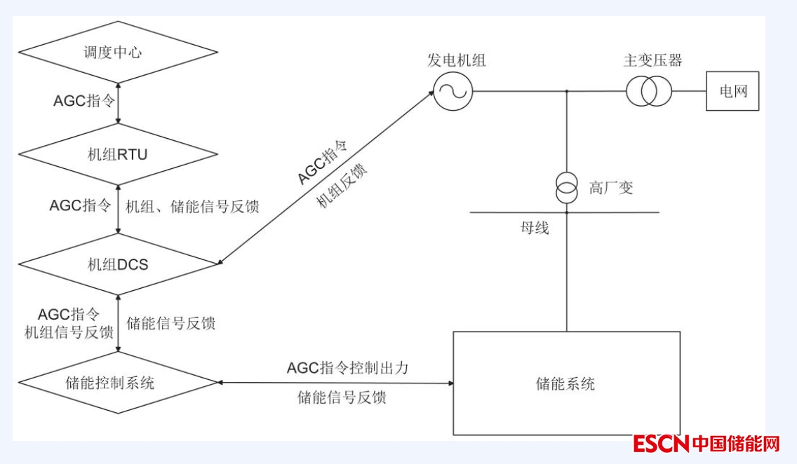 在機(jī)組投入AGC模式下,調(diào)度向機(jī)組遠(yuǎn)程終端單元(remote terminal unit,RTU)發(fā)送AGC調(diào)頻指令,RTU接收指令后,迅速將信號(hào)傳遞至機(jī)組分散控制系統(tǒng)(distributed control system,DCS),DCS控制機(jī)組向目標(biāo)值出力,同時(shí)將信號(hào)傳送至儲(chǔ)能控制系統(tǒng)。儲(chǔ)能控制系統(tǒng)根據(jù)調(diào)頻機(jī)組實(shí)時(shí)負(fù)荷與AGC指令目標(biāo)負(fù)荷之間的差值,控制儲(chǔ)能單元出力大小彌補(bǔ)差值,并向RTU和DCS反饋相應(yīng)信號(hào),RTU接收儲(chǔ)能和機(jī)組的反饋信號(hào)后,整合機(jī)組和儲(chǔ)能的出力情況并向相關(guān)數(shù)據(jù)上送調(diào)度,完成一個(gè)調(diào)頻周期?;饍?chǔ)聯(lián)合調(diào)頻系統(tǒng)的控制邏輯拓?fù)浣Y(jié)構(gòu)圖如圖4所示。