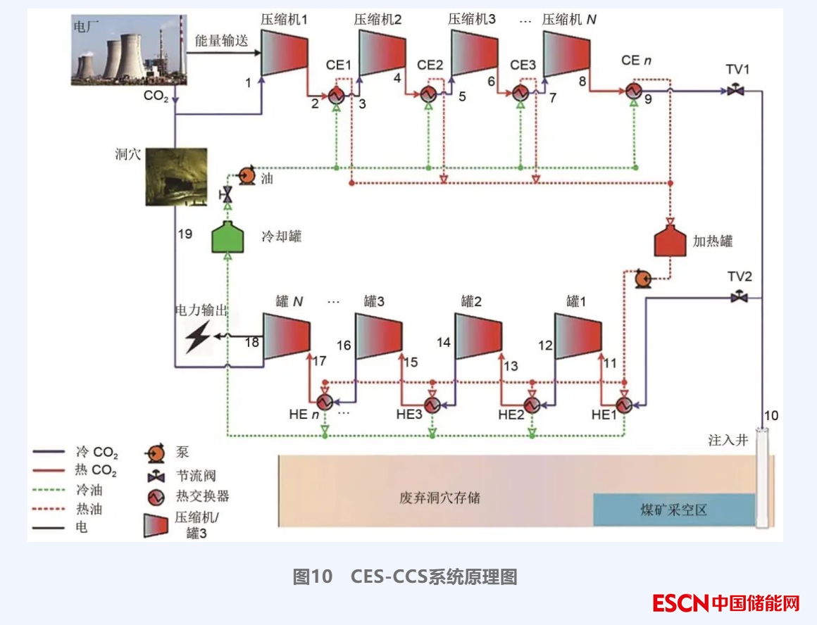 基于CCS技術(shù)的快速發(fā)展,如何合理應(yīng)用地下封存的CO2、降低CCS整體經(jīng)濟(jì)成本受到相關(guān)學(xué)者關(guān)注。文獻(xiàn)[34]提出了一種結(jié)合廢舊礦床存儲(chǔ)二氧化碳的二氧化碳儲(chǔ)能(CES-CCS)系統(tǒng)。如圖10所示,該系統(tǒng)的工作原理是將電廠捕獲的CO2經(jīng)過(guò)多級(jí)壓縮機(jī)壓縮,當(dāng)達(dá)到儲(chǔ)能壓力時(shí),CO2存儲(chǔ)過(guò)程停止,多余的CO2通過(guò)注入井進(jìn)行地下封存或驅(qū)油,釋能時(shí)CO2再進(jìn)入多級(jí)透平做功發(fā)電,出口CO2通過(guò)廢棄洞穴暫存。通過(guò)熱力學(xué)分析和參數(shù)分析,該系統(tǒng)在儲(chǔ)能壓力為21.9 MPa時(shí),最高RTE為53.75%,且在碳排放稅不超過(guò)47美元/噸時(shí)具有一定經(jīng)濟(jì)優(yōu)勢(shì)。但是,該系統(tǒng)將CO2遷移當(dāng)做理想滲流過(guò)程,在工程應(yīng)用時(shí)需要更深入細(xì)致的地質(zhì)勘探和模擬分析,所需要的應(yīng)用場(chǎng)景也較難吻合。