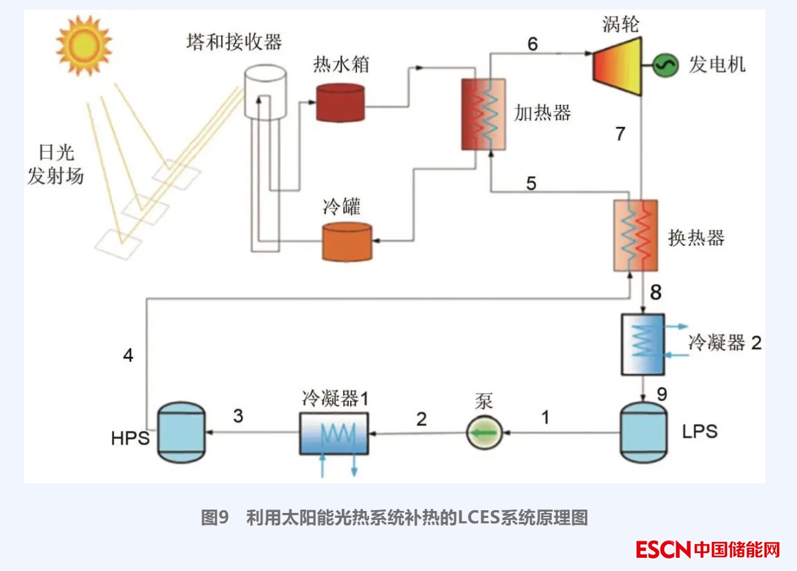 文獻(xiàn)[33]提出了一種利用太陽(yáng)能光熱系統(tǒng)補(bǔ)熱的LCES系統(tǒng),如圖9所示,該系統(tǒng)在透平入口前引入額外的光熱熱源,在透平出口設(shè)置回?zé)崞骰厥?00 ℃二氧化碳的余熱,從而提高了透平進(jìn)口溫度。與常規(guī)LAES系統(tǒng)相比,該系統(tǒng)具有較高的循環(huán)效率和?效率。但需要注意的是,該系統(tǒng)需要控制太陽(yáng)熱量的波動(dòng)以減小對(duì)LCES系統(tǒng)透平進(jìn)口溫度穩(wěn)定性的影響。