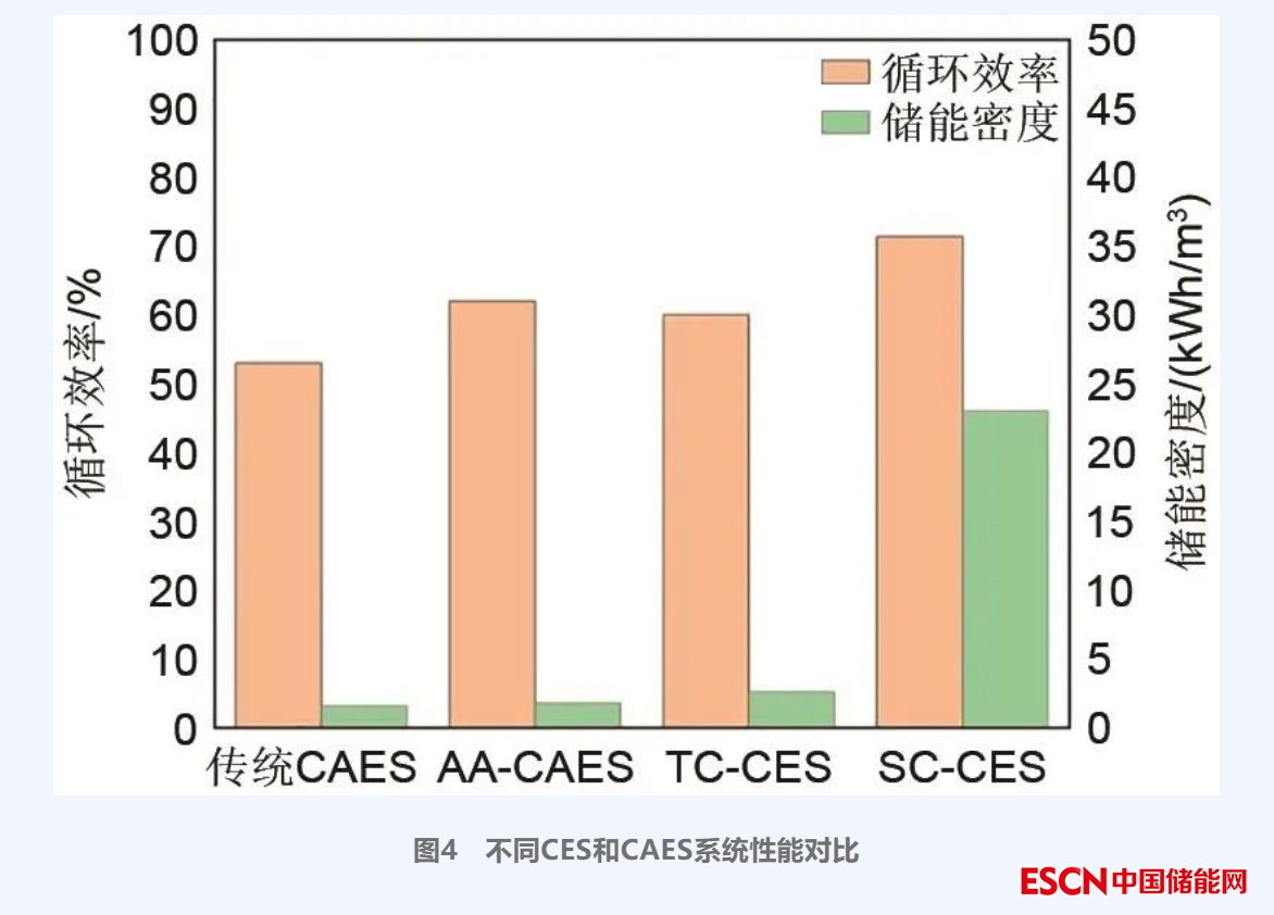 北京大學(xué)Zhang等研究了基于熱水蓄熱的跨臨界和超臨界壓縮二氧化碳儲(chǔ)能系統(tǒng)。如圖3所示,這兩種系統(tǒng)本質(zhì)上沒(méi)有區(qū)別,TC-CES系統(tǒng)相較于SC-CES系統(tǒng)另外設(shè)計(jì)了壓縮前預(yù)熱器,目的是使低壓儲(chǔ)罐中的液態(tài)CO2在進(jìn)入壓縮機(jī)前完全氣化,而SC-CES系統(tǒng)低壓儲(chǔ)罐中CO2本身就處于超臨界態(tài),可直接進(jìn)入壓縮機(jī)。研究發(fā)現(xiàn)系統(tǒng)以1 MW釋能功率輸出時(shí),跨臨界運(yùn)行CO2工質(zhì)流量為38.52 kg/s,循環(huán)效率為60%,儲(chǔ)能密度為2.6 kWh/m3;超臨界運(yùn)行CO2工質(zhì)流量為6.89 kg/s,循環(huán)效率為71%,?效率為71.38%,儲(chǔ)能密度為23 kWh/m3。結(jié)合文獻(xiàn)[21-22]的研究結(jié)果,圖4對(duì)比了傳統(tǒng)CAES、AA-CAES、TC-CES和SC-CES系統(tǒng)在釋能功率均為1 MW工況下的循環(huán)效率和能量密度數(shù)據(jù)。可以發(fā)現(xiàn),TC-CES的循環(huán)效率高于傳統(tǒng)CAES,但略低于AA-CAES,其儲(chǔ)能密度均高于傳統(tǒng)CAES和AA-CAES;而SC-CES的循環(huán)效率最大,且其儲(chǔ)能密度遠(yuǎn)高于其他三種系統(tǒng)。因此,雖然SC-CES比CAES系統(tǒng)額外增加了低壓儲(chǔ)存設(shè)備用于釋能過(guò)程中透平存儲(chǔ)出口CO2(對(duì)于SC-CES系統(tǒng)此時(shí)CO2仍處于超臨界態(tài)),但由于其工質(zhì)整體儲(chǔ)存容積需求較低,所以仍具有較高的儲(chǔ)能密度。
