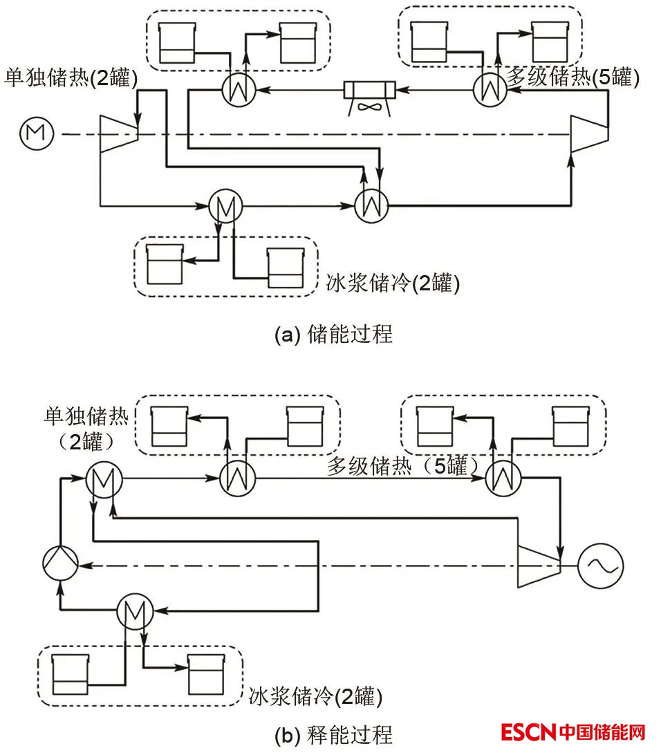 將CO2作為工質(zhì)并應(yīng)用于儲(chǔ)能系統(tǒng)最早是2012年由瑞士洛桑埃爾科爾理工大學(xué)的Morandin教授提出,他設(shè)計(jì)了一種基于熱水蓄熱、冰漿蓄冷的二氧化碳電熱儲(chǔ)能(thermo-electrical carbon dioxide energy storage,TE-CES)系統(tǒng),并基于換熱器網(wǎng)絡(luò)編寫(xiě)了系統(tǒng)優(yōu)化算法。如圖2所示,該系統(tǒng)的工作原理是:在儲(chǔ)能過(guò)程中,電能驅(qū)動(dòng)熱泵系統(tǒng)壓縮機(jī)將CO2壓縮至超臨界態(tài),并將CO2內(nèi)能通過(guò)蓄熱罐進(jìn)行儲(chǔ)存,即將電能以熱能形式儲(chǔ)存;在釋能過(guò)程中,CO2吸收蓄熱器熱能,再進(jìn)入膨脹機(jī)做功,即將熱能轉(zhuǎn)化為電能輸出。