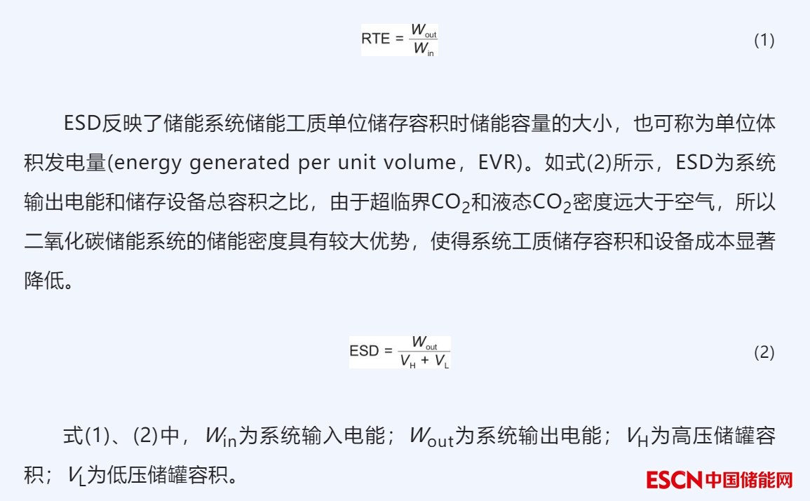 對(duì)于壓縮氣體儲(chǔ)能系統(tǒng),最能反映系統(tǒng)儲(chǔ)能特性的評(píng)價(jià)指標(biāo)主要有系統(tǒng)循環(huán)效率(round trip efficiency,RTE)和儲(chǔ)能密度(energy storage density,ESD)。