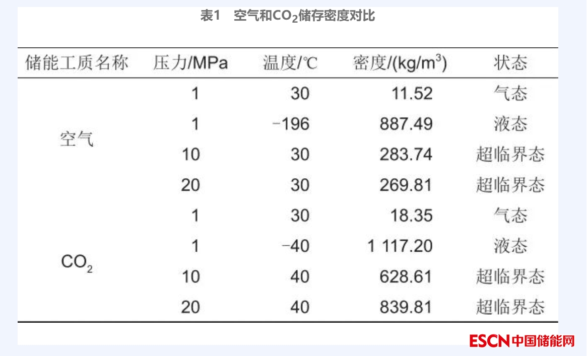 為了進(jìn)一步提高儲(chǔ)能系統(tǒng)的儲(chǔ)能效率與能量密度,相關(guān)學(xué)者提出了以CO2為工質(zhì)的二氧化碳儲(chǔ)能(carbon dioxide energy storage,CES)系統(tǒng),由于CO2臨界點(diǎn)(7.39 MPa和31.4 ℃)相對(duì)空氣(3.77 MPa和-140.5 ℃)容易達(dá)到,無(wú)毒、不易燃、安全等級(jí)為A1,且超臨界二氧化碳(S-CO2)具有優(yōu)良的熱力學(xué)性質(zhì):黏度小、密度大、導(dǎo)熱性能好,系統(tǒng)寄生能耗也相對(duì)較低。基于常規(guī)儲(chǔ)能設(shè)計(jì)參數(shù),表1展示了不同壓力和對(duì)應(yīng)溫度下空氣和CO2的密度大小,可以看出,相同狀態(tài)和壓力下CO2儲(chǔ)存密度均大于空氣,其中液態(tài)儲(chǔ)存時(shí)最高,從而使得CES系統(tǒng)具有較高的儲(chǔ)能潛力。