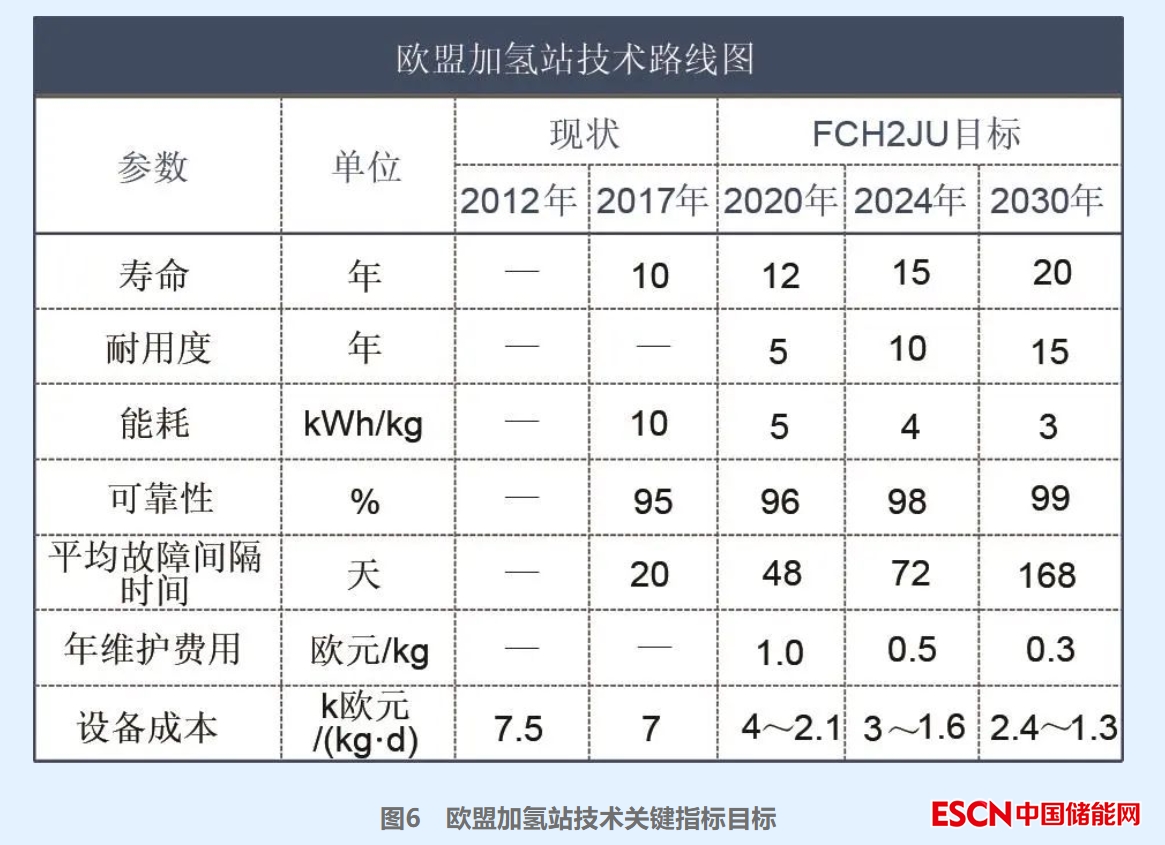 歐盟在2013年制定了加氫技術(shù)路線圖,歐盟內(nèi)部強(qiáng)調(diào)氫能在加注階段的經(jīng)濟(jì)性,從整站的壽命、穩(wěn)定性、能耗等方面制定了技術(shù)目標(biāo)。2018年在FCH2JU框架下,基于產(chǎn)業(yè)發(fā)展趨勢(shì)與現(xiàn)狀更新了加氫技術(shù)2030年技術(shù)發(fā)展展望,整站能耗目標(biāo)下降至3 kWh/kg,投資成本降至1300~2400歐元/(kg·d),年維護(hù)費(fèi)用降至0.3歐元/kg,平均故障間隔時(shí)間超過5個(gè)月,如圖6所示。同時(shí)表示將優(yōu)先研究液氫儲(chǔ)存和加注技術(shù),以擴(kuò)大集中式制氫站點(diǎn)的供應(yīng)并使其具有商業(yè)可行性。
