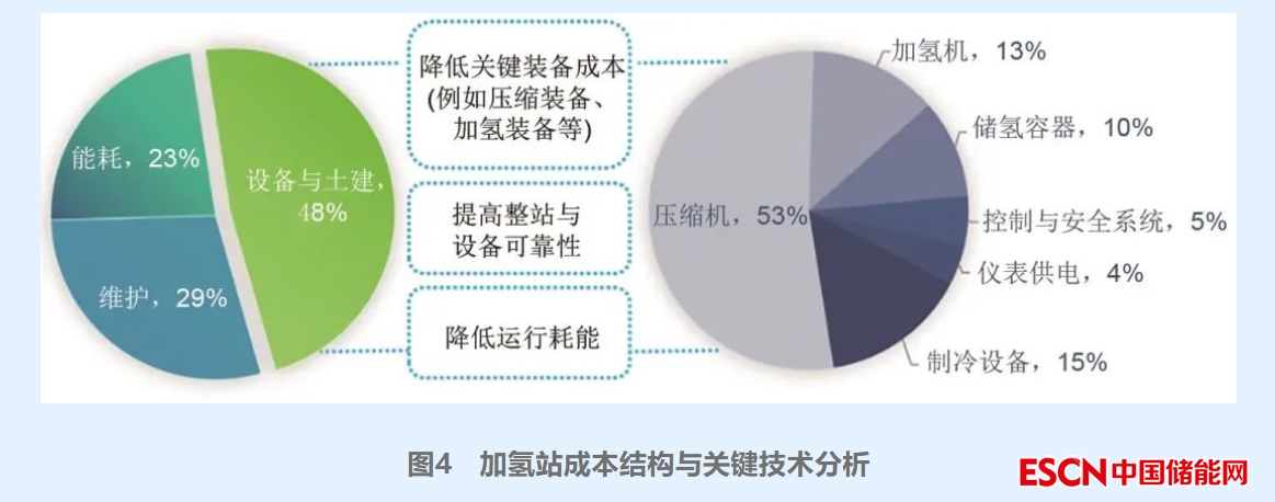 根據(jù)美國能源部的測(cè)算,500 kg/d加注能力的加氫站平準(zhǔn)化成本中,壓縮機(jī)成本占50%以上,制冷設(shè)備與加氫機(jī)緊隨其后,如圖4所示。除建設(shè)投資外,整站的運(yùn)行能耗與維護(hù)成本占比超過50%,歸因于壓縮機(jī)、加氫機(jī)等關(guān)鍵裝備的可靠性不足、壓縮與預(yù)冷等功能運(yùn)行能耗高等。