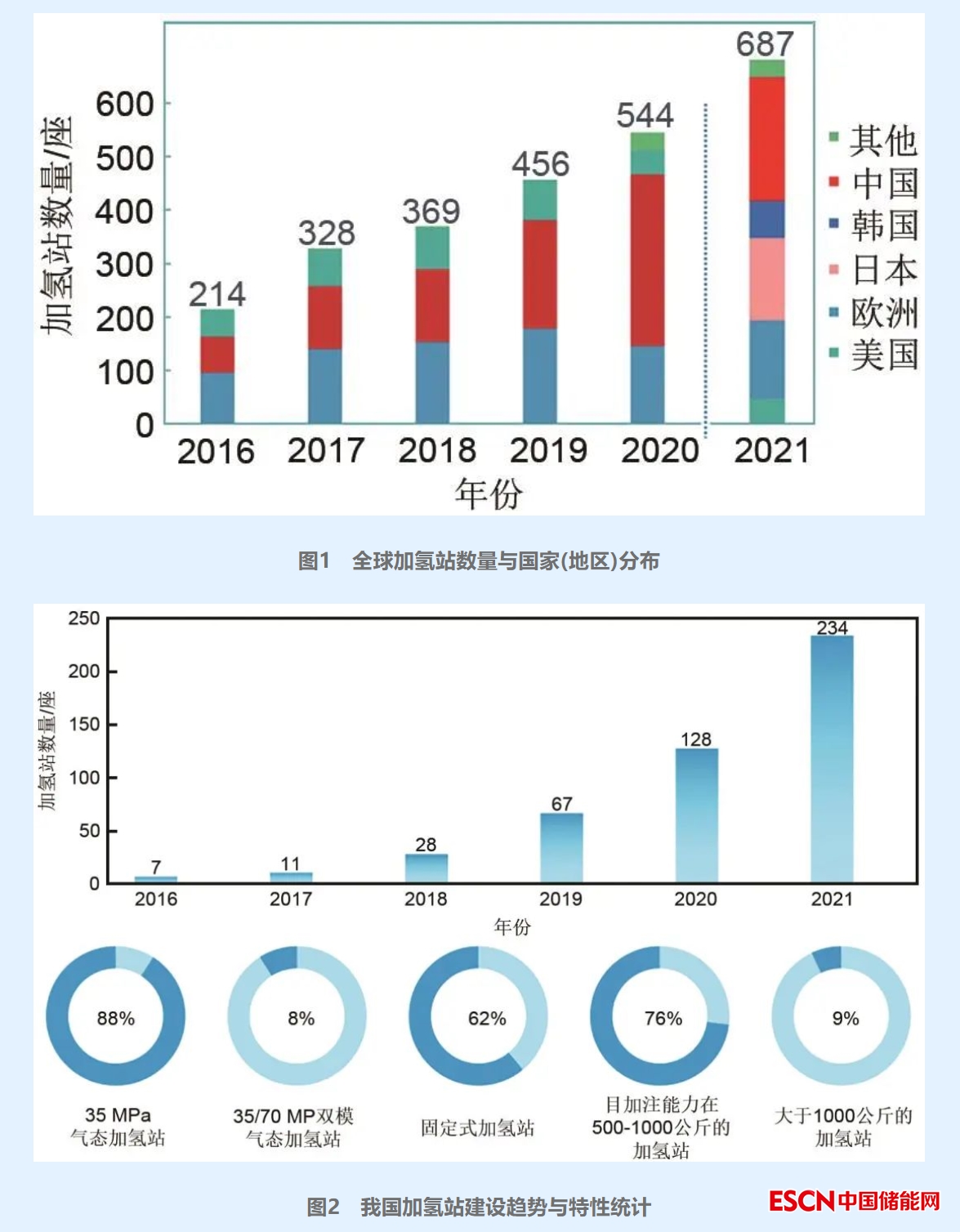 加氫站是氫能在交通領(lǐng)域進(jìn)行大規(guī)模應(yīng)用的重要基礎(chǔ)設(shè)施,加氫站作為氫能供應(yīng)和氫能應(yīng)用的連接節(jié)點(diǎn),技術(shù)發(fā)展與氫供應(yīng)鏈和燃料電池電動(dòng)汽車用氫需求密不可分。隨著燃料電池汽車需求的增長,世界各國開始加快加氫站的建設(shè)步伐。根據(jù)中國氫能聯(lián)盟統(tǒng)計(jì),截至2021年12月,全球已建成687座加氫站,以70 MPa高壓氣態(tài)加氫站為主,占比70%以上。固定式加氫站占比80%以上。液氫加氫站主要分布在美國、德國和日本,據(jù)不完全統(tǒng)計(jì),占比不到5%。國外在線制氫加氫站是氫能與燃料電池發(fā)展初期的一種重要加氫站形式,制氫加氫一體站占比約15%。我國加氫站保有量最高,共建成234座加氫站,2021年新建成加氫站106座。日本、德國、韓國和美國緊隨其后,分別為155座、92座、70座和47座。中國加氫站建設(shè)進(jìn)入快速發(fā)展階段,新增加氫站數(shù)量連續(xù)兩年全球第一,同時(shí)固定站的占比逐漸增加。我國目前加氫站仍以35 MPa為主,占比高達(dá)88%,固定式加氫站占比提升至62%左右,制氫加氫一體站受制于標(biāo)準(zhǔn)與法規(guī),僅在佛山建成一座天然氣站內(nèi)制氫站。