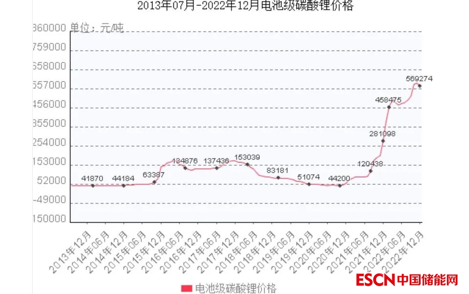 新能源汽車發(fā)展如火如荼,對(duì)鋰電池相關(guān)產(chǎn)品的需求不斷增長(zhǎng),碳酸鋰、氫氧化鋰等供不應(yīng)求,價(jià)格一路高漲。以電池級(jí)碳酸鋰為例,根據(jù)野天鵝網(wǎng)的跟蹤統(tǒng)計(jì),2020年其價(jià)格僅為4萬~5萬元/噸,2021年初達(dá)到7.2萬元,而至2021年底已漲至28萬元/噸。進(jìn)入2022年,電池級(jí)碳酸鋰價(jià)格繼續(xù)快速上漲,3月一度突破50萬元/噸大關(guān),之后略有回落,但8月下旬再次開啟上漲模式,11月一度逼近60萬元/噸大關(guān),目前約為57萬元/噸。也就是說,與2020年相比,電池級(jí)碳酸鋰價(jià)格在兩年內(nèi)暴漲逾十倍。