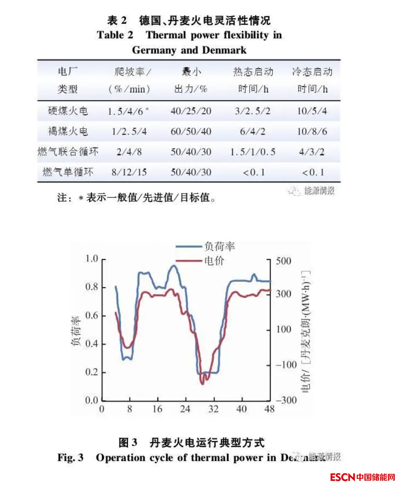 德國、丹麥火電靈活性情況見表2,目前在丹麥、德國,硬煤火電機組最小出力可達25%~30%,褐煤機組最小出力可達40%~50%,爬坡速率可分別達到4%/min~6%/min和2.5%/min~4%/min。在電力現(xiàn)貨市場中,這些機組往往根據(jù)電價信號及時調(diào)整自身出力,在低電價甚至負電價時降低出力甚至停機,以獲得更優(yōu)的市場回報,其火電運行典型方式如圖3所示。