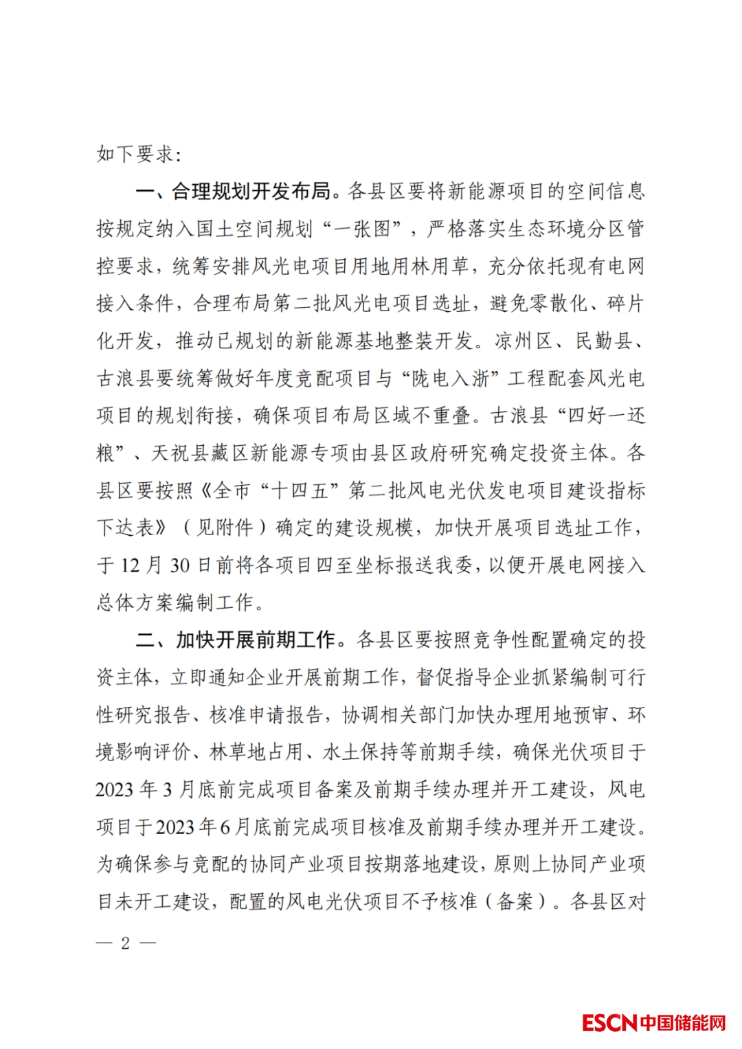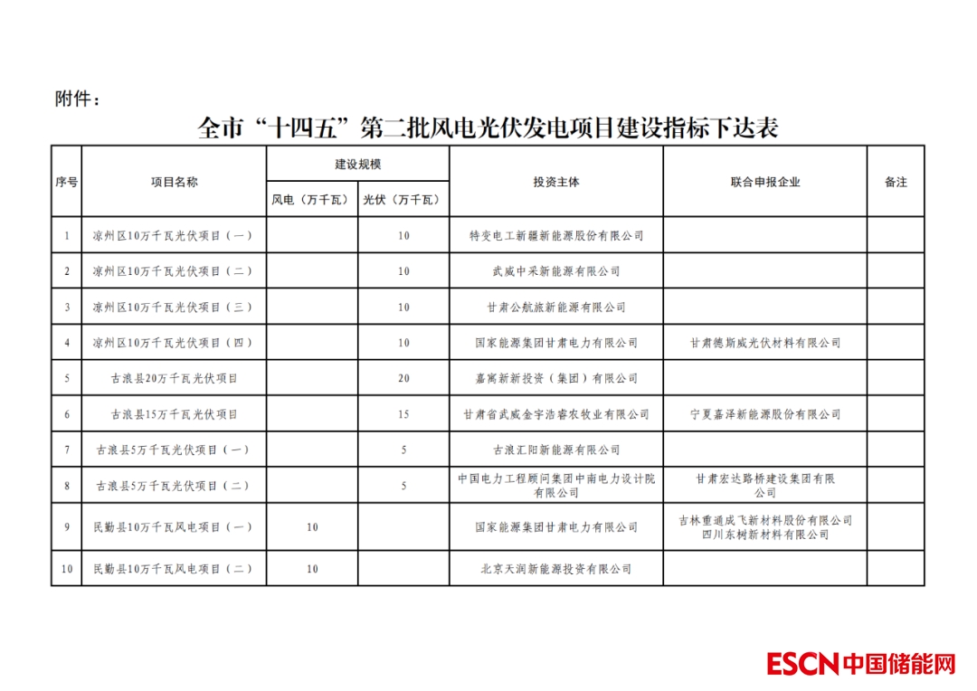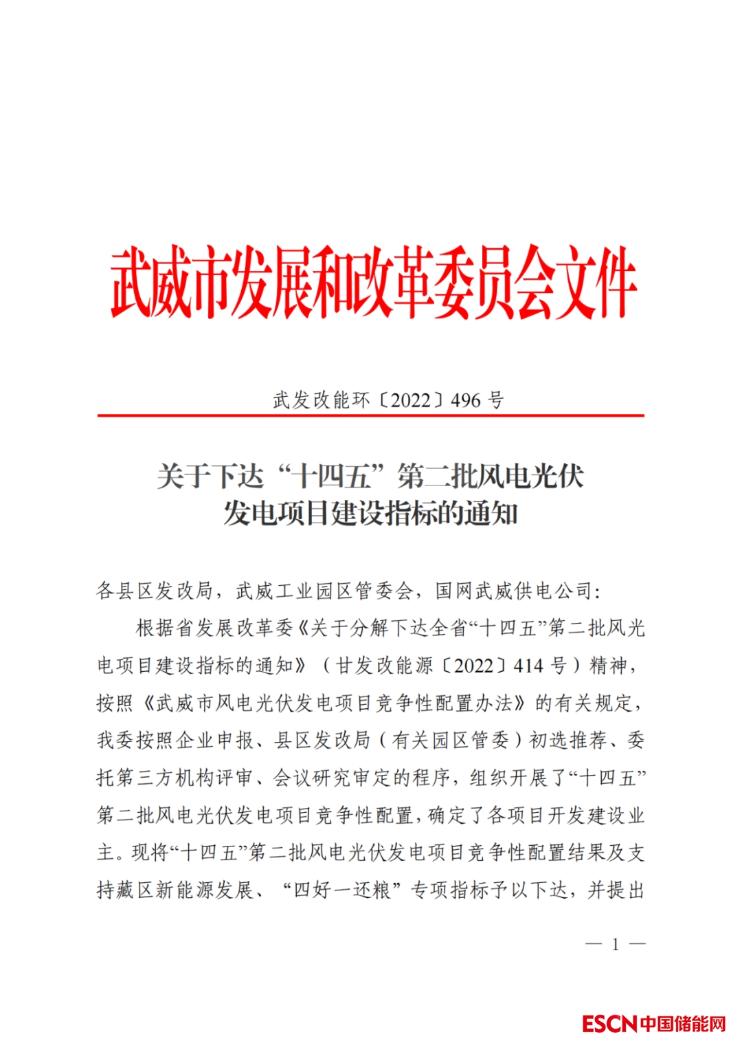 中國儲能網(wǎng)訊:12月21日,甘肅省武威市發(fā)改委發(fā)布《關(guān)于下達“十四五”第二批風電光伏發(fā)電項目建設(shè)指標的通知》。
