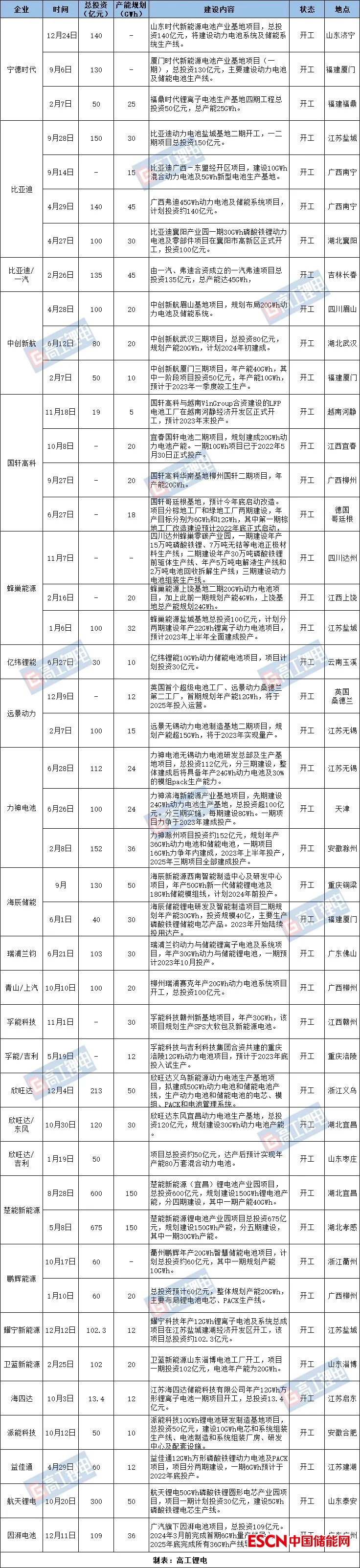 從統(tǒng)計(jì)數(shù)據(jù)來(lái)看,在開(kāi)工的44個(gè)項(xiàng)目中,總投資在100億以上的23個(gè)。與此前相比,今年動(dòng)力電池企業(yè)同時(shí)啟動(dòng)多個(gè)基地同步建設(shè)。其中,中創(chuàng)新航眉山、武漢基地,蜂巢能源上饒、鹽城基地,力神無(wú)錫、滁州、天津基地,比亞迪長(zhǎng)春、南寧、襄陽(yáng)基地等均在短期內(nèi)陸續(xù)開(kāi)工。