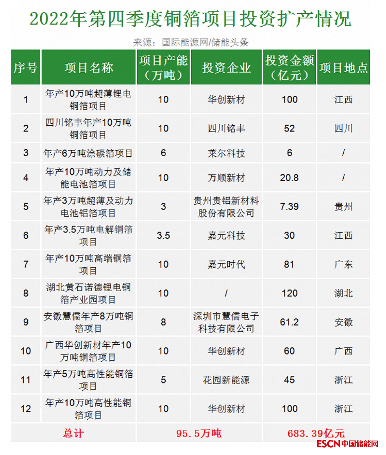當前,主流銅箔企業(yè)均在加碼擴產(chǎn)。據(jù)國際能源網(wǎng)/儲能頭條統(tǒng)計,今年第四季度以來包括嘉元科技、華創(chuàng)新材、萬順新材等企業(yè)合計投資超683億元擴產(chǎn),最終產(chǎn)能達95.5萬噸。