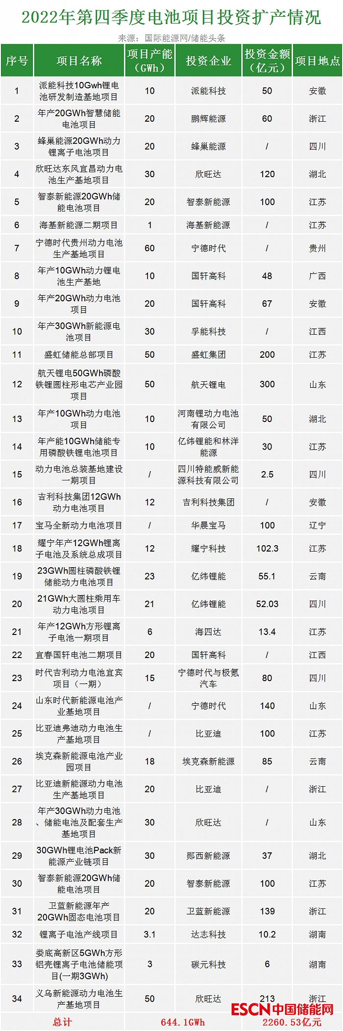 據(jù)統(tǒng)計,2022年第四季度,以派能科技、鵬輝能源、寧德時代、國軒高科、億緯鋰能等為代表的鋰電池企業(yè)相繼公布了多個新投建項目,整體投建資金超2260.53億元,建設年產(chǎn)能達644.1GWh(部分項目未披露投資金額及產(chǎn)能),較去年同期擴產(chǎn)能步子邁的更大。