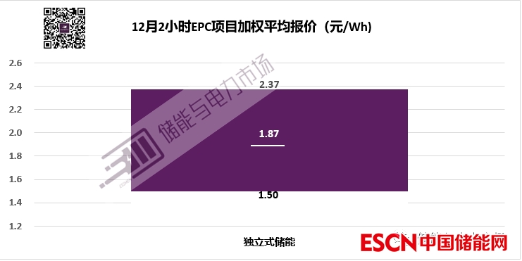 12月的儲能EPC中標(biāo)全部為獨立式儲能項目2小時儲能系統(tǒng),最高報價2.37元,最低報價1.50元,加權(quán)平均報價為1.87元/Wh。相比較11月2小時獨立式儲能項目EPC的加權(quán)平均報價2.044元/Wh,略有下降。
