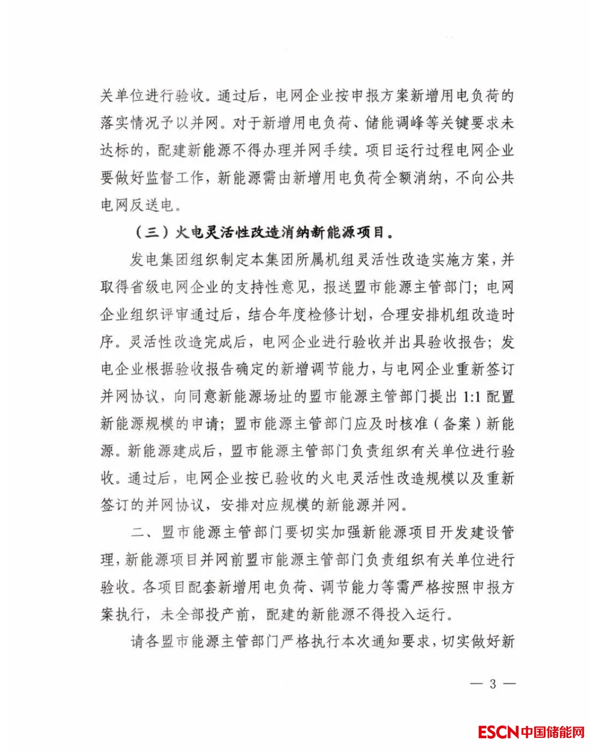 發(fā)電企業(yè)根據(jù)電網(wǎng)企業(yè)的驗(yàn)收?qǐng)?bào)告確定的新增調(diào)節(jié)能力,與電網(wǎng)企業(yè)重新簽訂并網(wǎng)協(xié)議,向同意新能源場(chǎng)址的盟市能源主管部門提出1:1配置新能源規(guī)模的申請(qǐng)。通過(guò)后,電網(wǎng)企業(yè)按已驗(yàn)收的火電靈活性改造規(guī)模以及重新簽訂的并網(wǎng)協(xié)議,安排對(duì)應(yīng)規(guī)模的新能源并網(wǎng)。