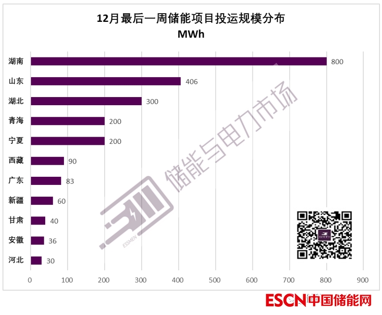 12月最后一周,湖南、山東、湖北、青海、寧夏、廣東、河北、安徽、新疆、甘肅、西藏等10個省/自治區(qū)均有項目投運,湖南投運量最大,達到400MW/800MWh。
