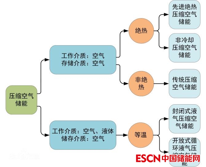 壓縮空氣儲能是指在電網(wǎng)負荷低谷期將電能用于壓縮空氣,將空氣高壓密封在報廢礦井、儲氣罐、山洞、過期油氣井或新建儲氣井中,在電網(wǎng)負荷高峰期釋放壓縮空氣推動汽輪機發(fā)電的儲能方式。相比興建鋼罐等壓力容器儲存的方式,利用鹽穴等地下洞穴建設(shè)大容量電站,將顯著降低原材料、用地等方面的成本。按照工作介質(zhì)、存儲介質(zhì)與熱源可以分為:傳統(tǒng)壓縮空氣儲能系統(tǒng)(需要補燃)、帶儲熱裝置的壓縮空氣儲能系統(tǒng)、液氣壓縮儲能系統(tǒng)等。