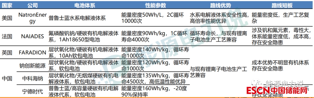 代表廠商包括NatronEnergy、NAIADES、FARADION、鈉創(chuàng)新能源、中科海納、寧德時代。