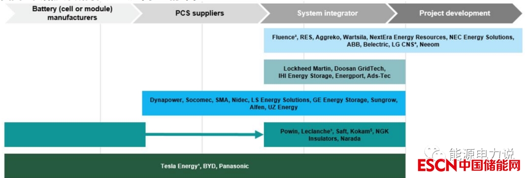 全產(chǎn)業(yè)鏈布局:電芯、PCS、BMS、EMS均為自產(chǎn),國內(nèi)代表企業(yè)為比亞迪。