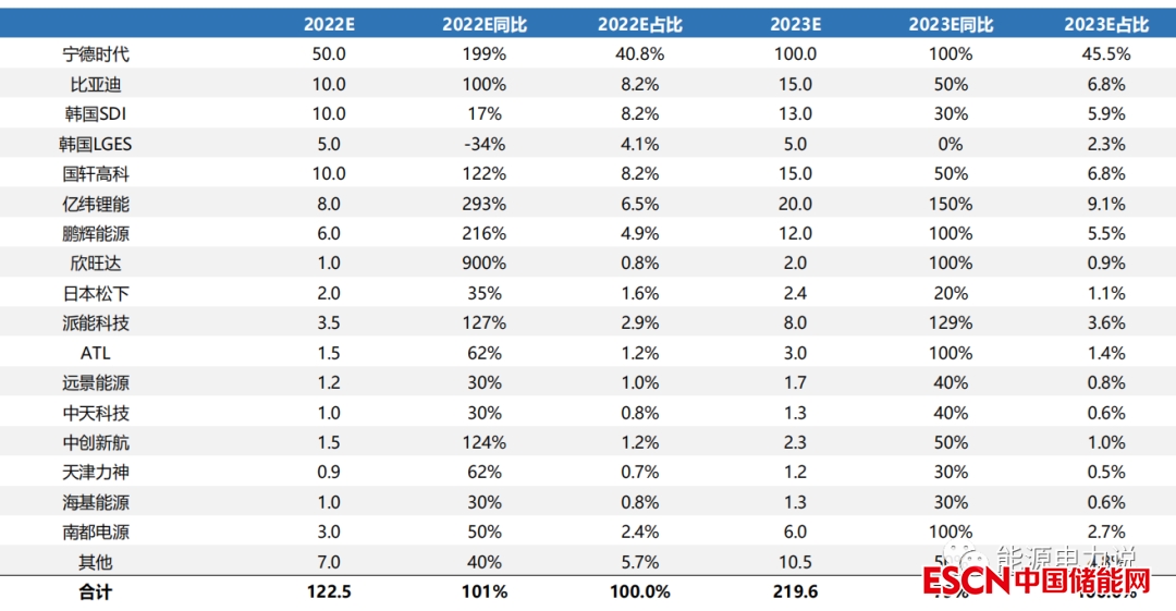 根據(jù)我們的測算,我們預(yù)計2022-2023年全球儲能電芯出貨122.5/219.6GWh,同增101%/79%;其中,寧德時代作為最大電芯供應(yīng)商占據(jù)榜首,我們預(yù)計寧德時代2022-2023年出貨50/100GWh,同增199%/100%,占比40.8%/45.5%,龍頭地位穩(wěn)固。