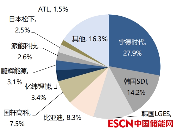 全球儲能電芯中國廠商出貨領(lǐng)先,寧德時代出貨量全球第一。