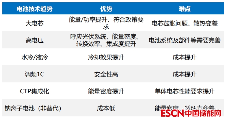 根據(jù)工信部要求,儲能型電池能量密度≥145Wh/kg,電池組能量密度≥110Wh/kg。循環(huán)壽命≥5000次且容量保持率≥80%。當前的電化學(xué)儲能尤其是鋰電儲能技術(shù)進入了一個新變革周期,大電芯、高電壓、水冷/液冷等新產(chǎn)品新技術(shù)逐漸登上舞臺,儲能系統(tǒng)向大容量方向在持續(xù)演進,同時鈉離子電池在未來憑借成本優(yōu)勢可能占據(jù)一席之位。