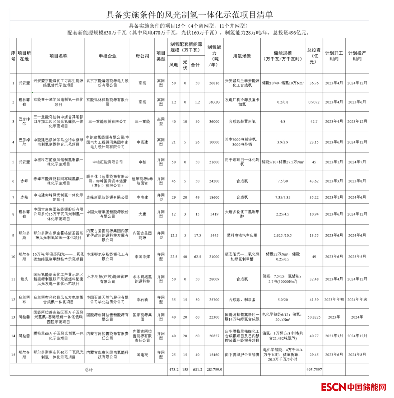 具備實施條件的項目15個(4個離網(wǎng)型,11個并網(wǎng)型),配套新能源規(guī)模631.2萬千瓦(其中風電473.2萬千瓦,光伏158萬千瓦),制氫能力28.2萬噸/年,總投資495.8億元(詳見附件)。