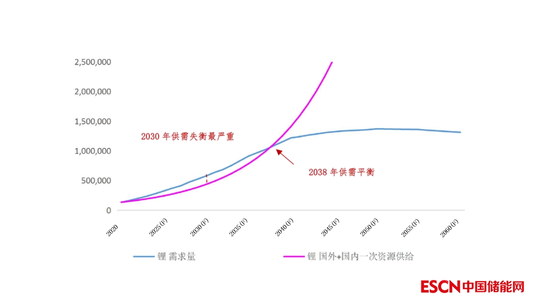 圖2 我國(guó)鋰資源自身供需曲線-考慮回收(LCE噸)