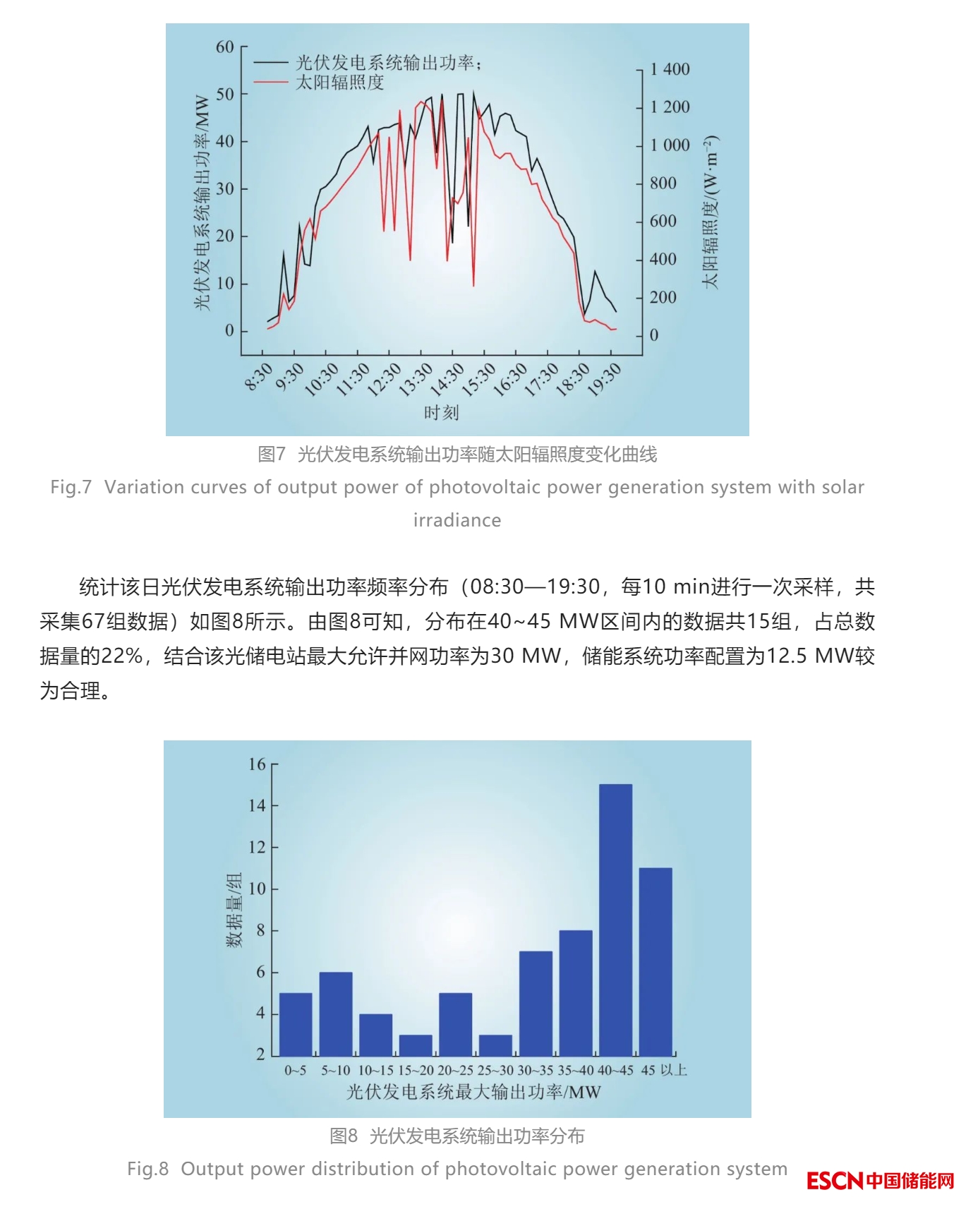 由表6可知,光伏棄電量隨儲能系統(tǒng)最大輸出功率的增大逐漸減小,儲能系統(tǒng)最大輸出功率由0增加到12.5 MW時,每增加2.5 MW光伏棄電量平均減少15.5 MW·h,由12.5 MW增加到17.5 MW時,每增加2.5 MW光伏棄電量減少6.885 MW·h,且儲能系統(tǒng)最大輸出功率為12.5 MW時,光伏棄光率低于5%。綜合光伏棄電率和儲能系統(tǒng)建設(shè)成本,選擇配置儲能系統(tǒng)最大輸出功率為12.5 MW,配比時長為8 h,即儲能系統(tǒng)容量配置為100 MW·h,用于減少光伏電量損失與夜間負荷供給需求。