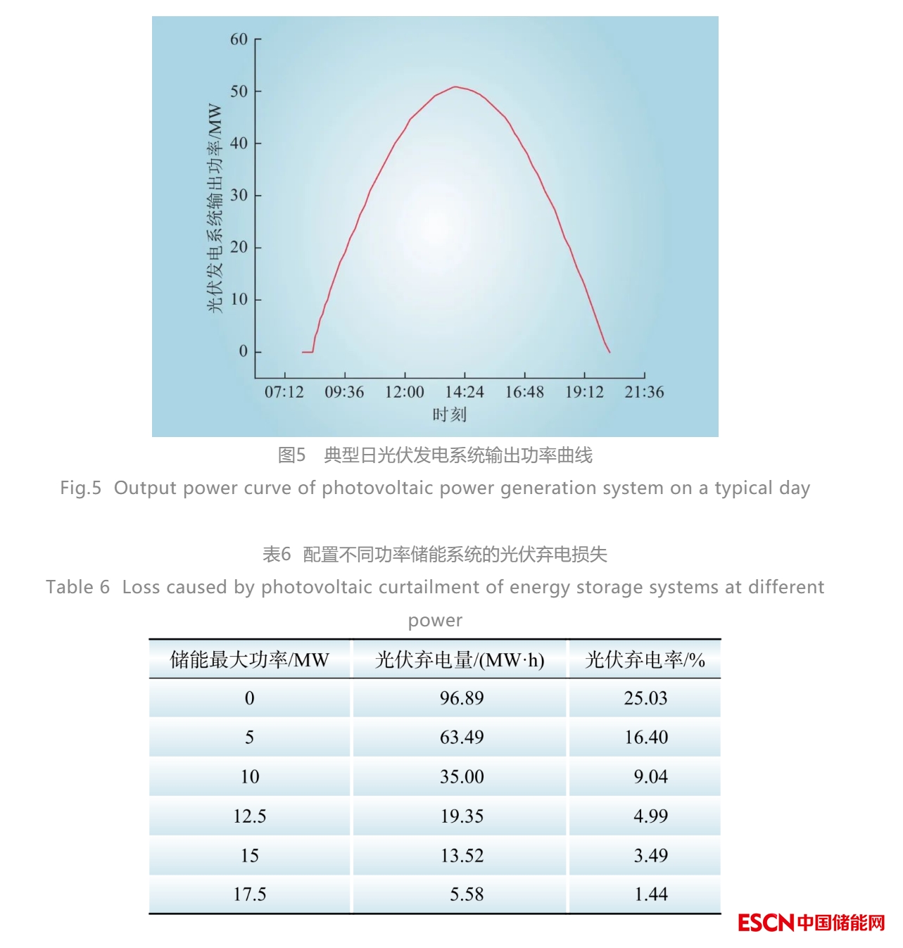 模擬夏至日光伏系統(tǒng)輸出功率曲線如圖5所示,由圖5計算可知,該日光伏系統(tǒng)最大可發(fā)電量約387.16 MW·h,但受地區(qū)調(diào)度限制,該電站最大允許并網(wǎng)功率僅為光伏最大裝機容量的60%,即30 MW,若不配置儲能系統(tǒng),將存在約96.89 MW·h電量損失,光伏棄電率達25%。配置不同功率儲能系統(tǒng)的光伏棄電損失如表6所示。